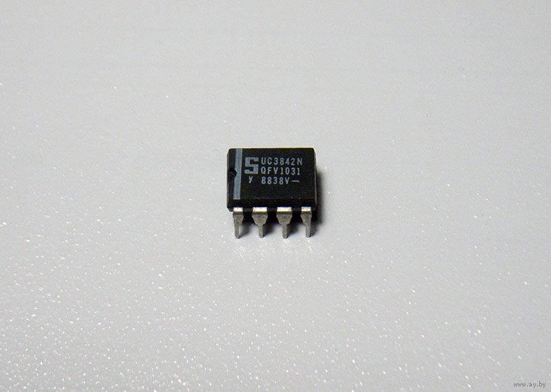 Микросхема UC3842N представляет собой ШИМ–контроллер с обратной связью по току и напряжению для управления импульсными источниками вторичного электропитания. Предназначены для работы в режиме DC-DC (преобразовывает постоянное напряжение одной величины в постоянное напряжение другой) в радиоаппаратуре и электронной технике широкого применения. Тип корпуса: DIP-8.