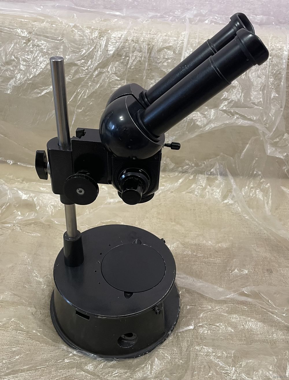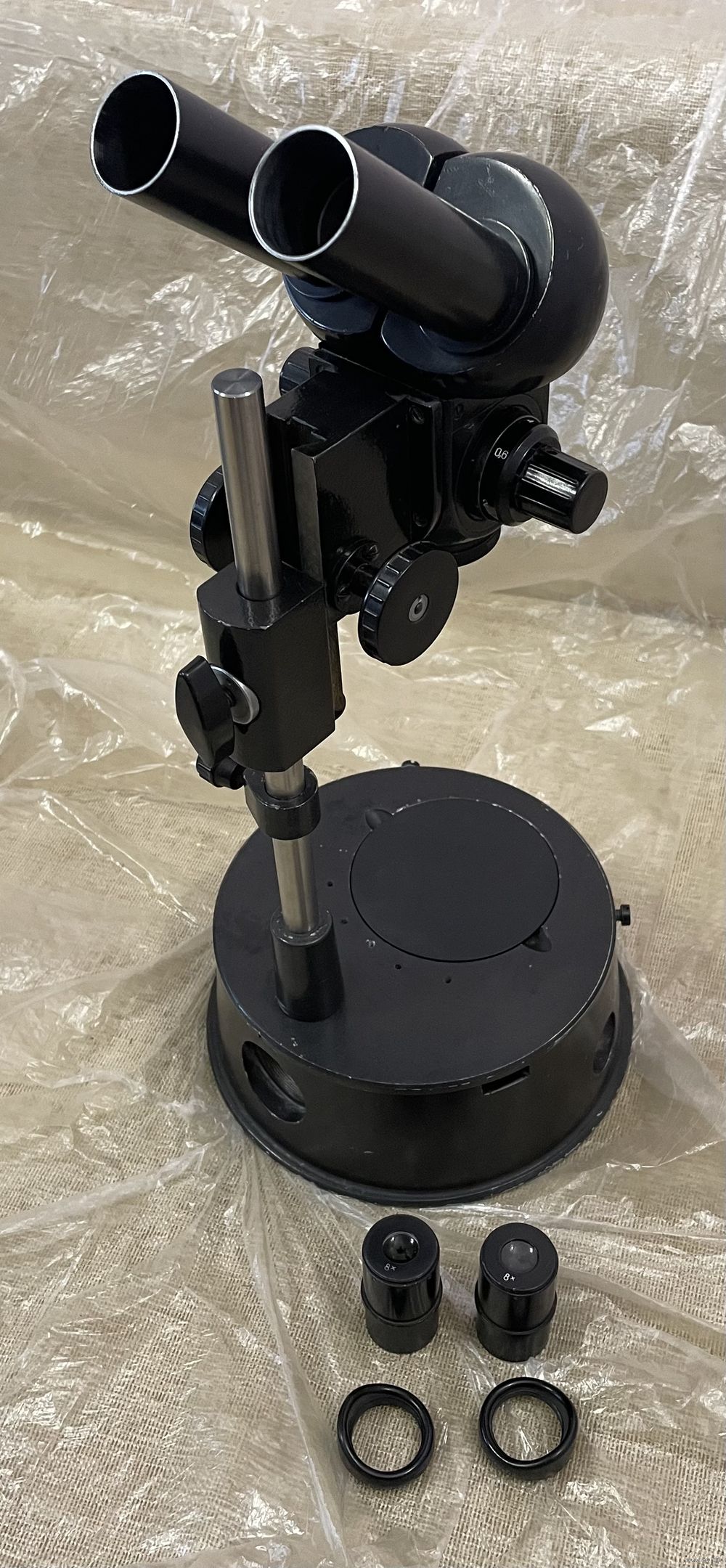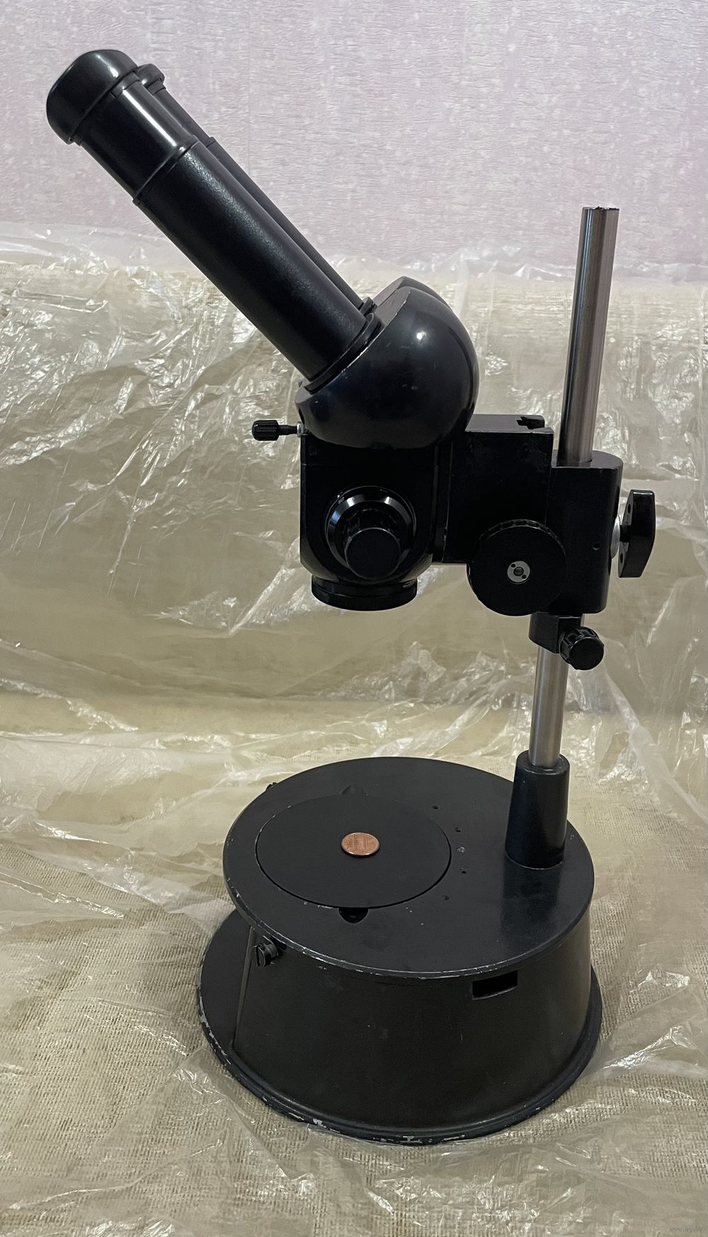 Микроскоп в рабочем состоянии. На первых фото микроскоп установлен в рабочее положение с расстоянием до объекта 145мм, на самом первом фото - максимальная возможность штатива. Отлично подходит для ювелирных, реставрационных работ, для ремонта телефонов и другой техники. Есть вопросы , звоните.