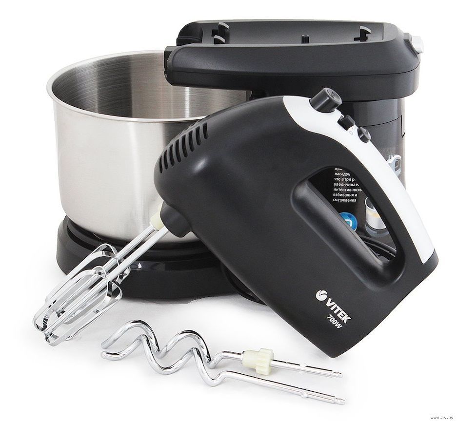Миксер VITEK VT-1417 ST Мощность 700Вт. Объем чаши 2,8л. Материал чаши сталь. Материал корпуса пластик. 5 скоростей. Турборежим. Крюки для замешивания теста. Венчик для взбивания 2шт.