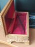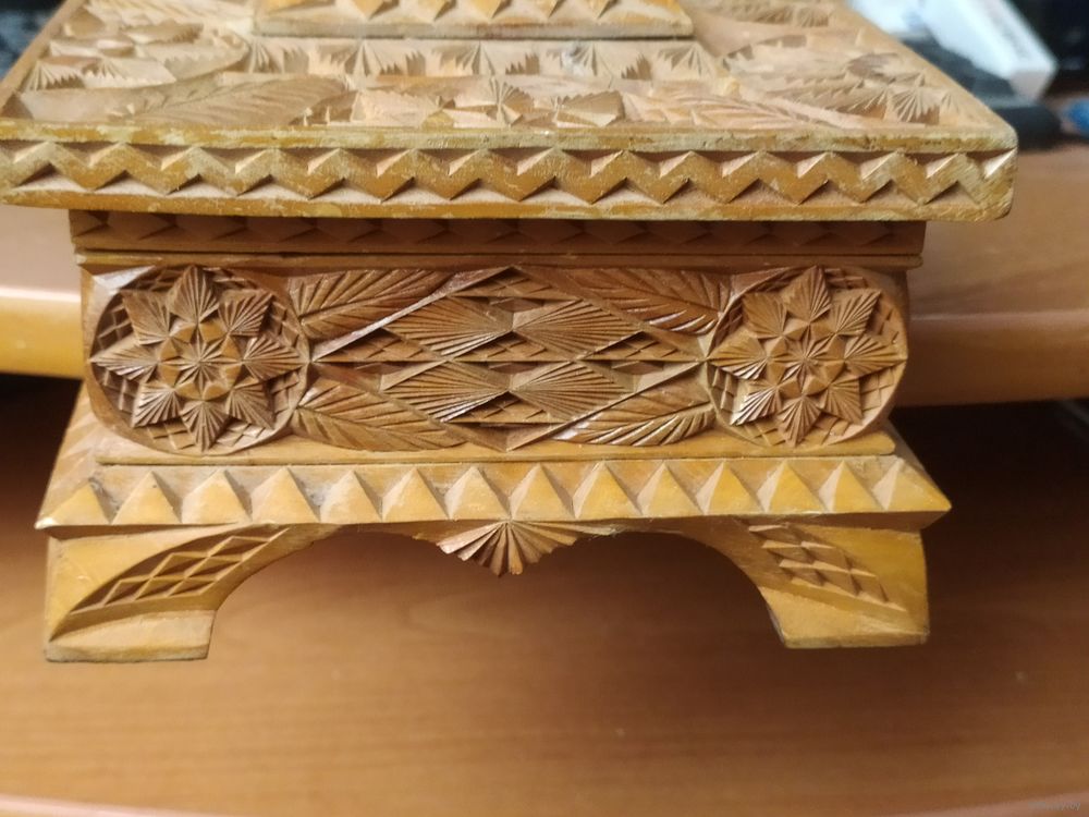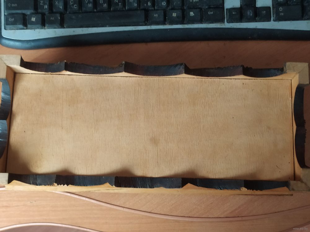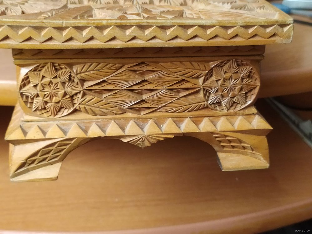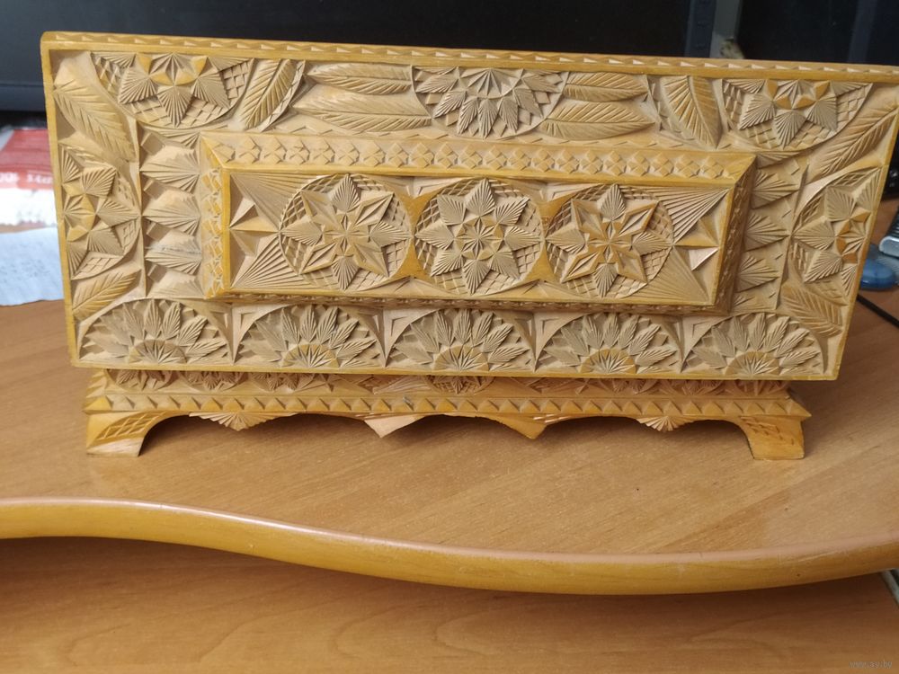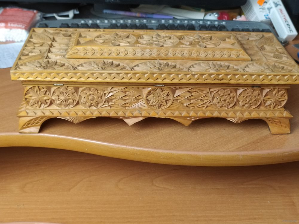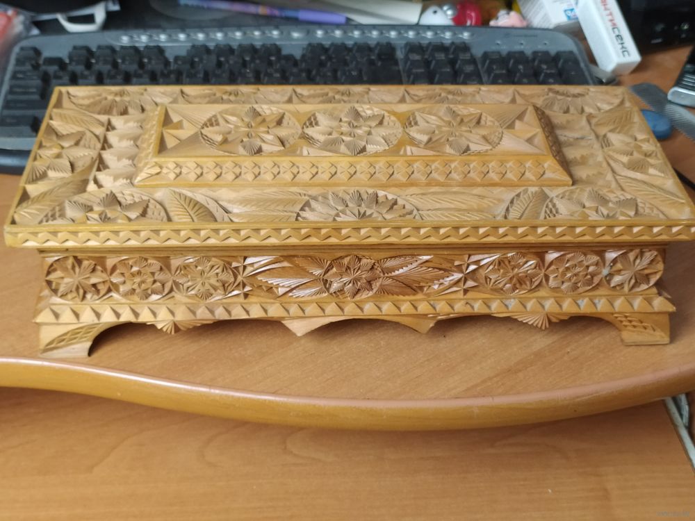 Вполне вероятно карельская берёза. Резьба, ручная работа. Размеры: по днищу 32*11,7 см. По верху 34,5*14,5 см, ширина нижней части верх 14 см, нижней 14 см. Ширина крышки 14,5 см. Высота 8,5 см, длина внутренней стороны 30 см, ширина 10,8 см. Вес примерно 800 грамм.