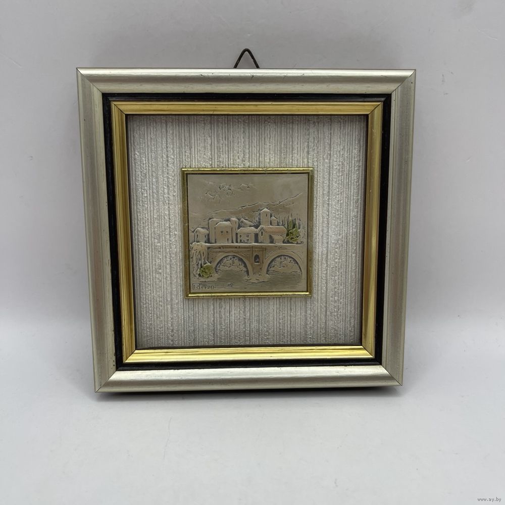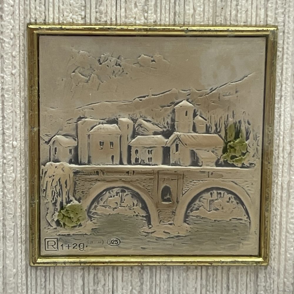 Винтажная миниатюрная картина-барельеф ручной работы на серебре 925 пробы. Объемное изображение Чертова моста в итальянском Чивидале-дель-Фриули. Миниатюра под стеклом, в деревянной раме с паспарту. Италия. Пробы, клейма. Сертификат-гарантия. Размер 11,5 х 11,5 см. С подвесом. Незначительные потертости на рамах (см. фото).