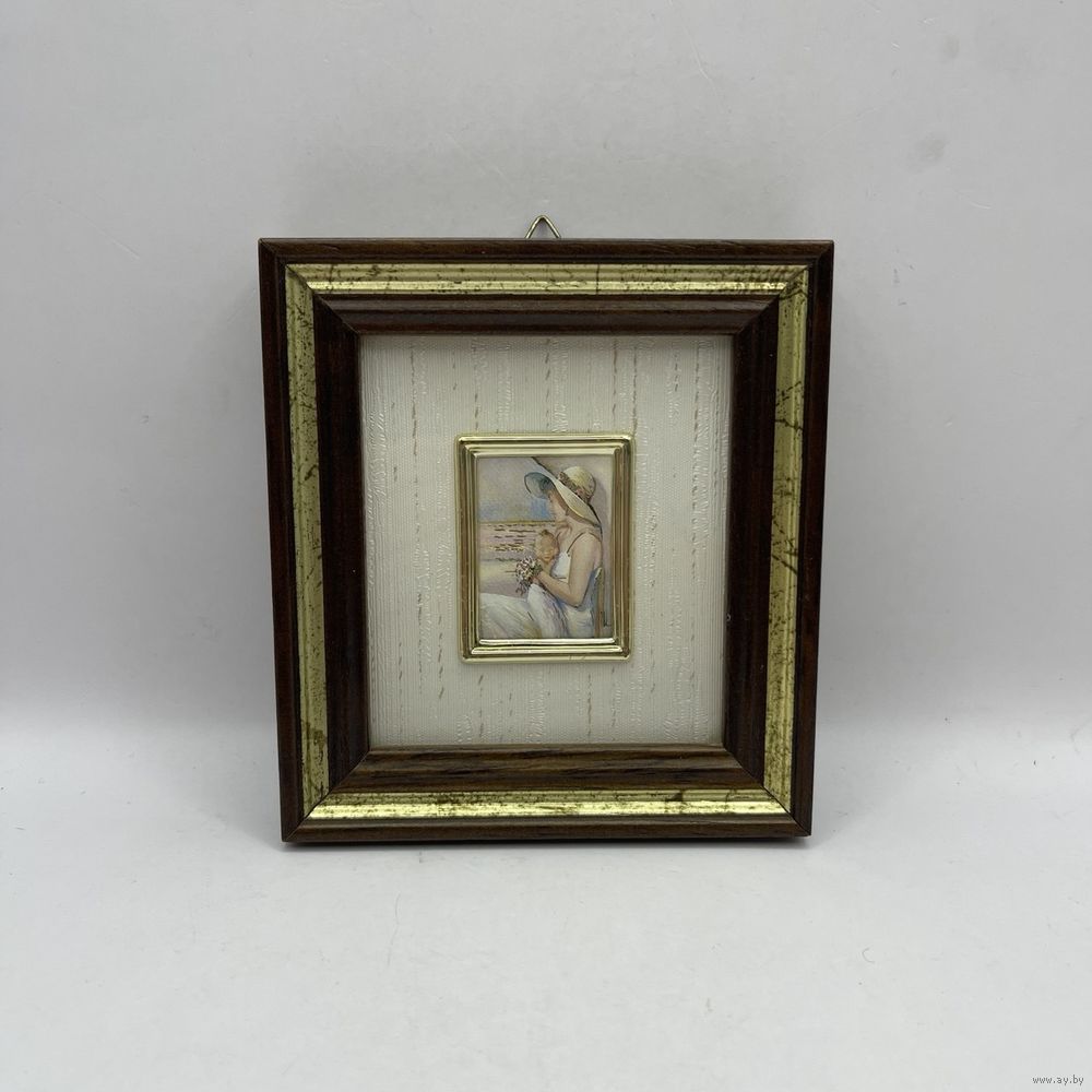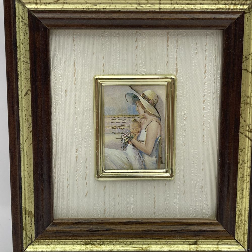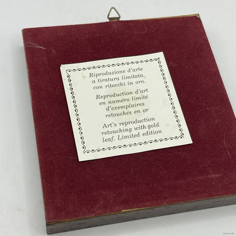 Винтажная художественная репродукция ручной работы на сусальном золоте с сюжетным изображением молодой женщины с ребенком. В деревянной раме ручной работы, под стеклом. Италия. 1970-е г.г. Сертификат. Лимитированная серия. Размер 10,5 х 11,5 см. С подвесом.