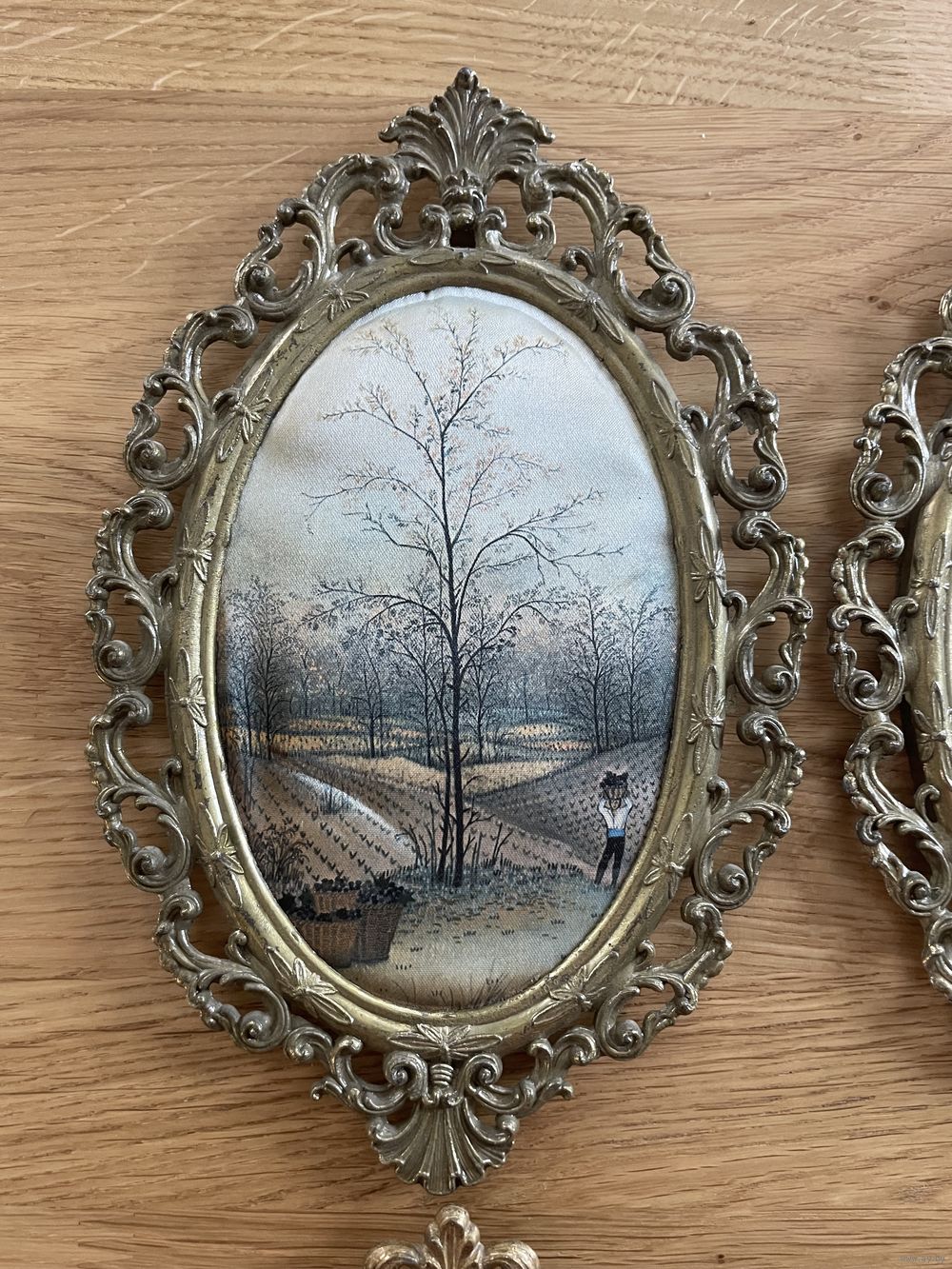Выставляю на аукцион изящный комплект из 4 миниатюрных картин, две выполненных на шелке, 2 это фотопечать.