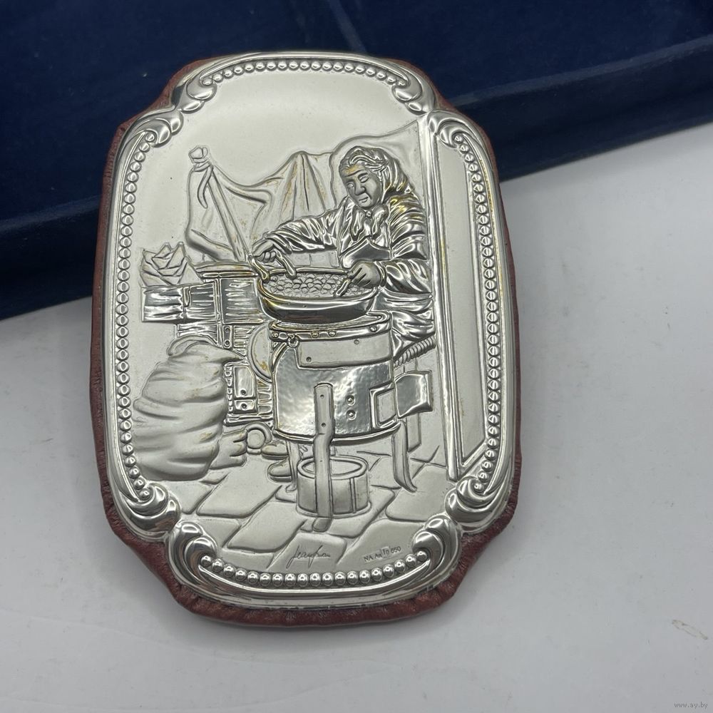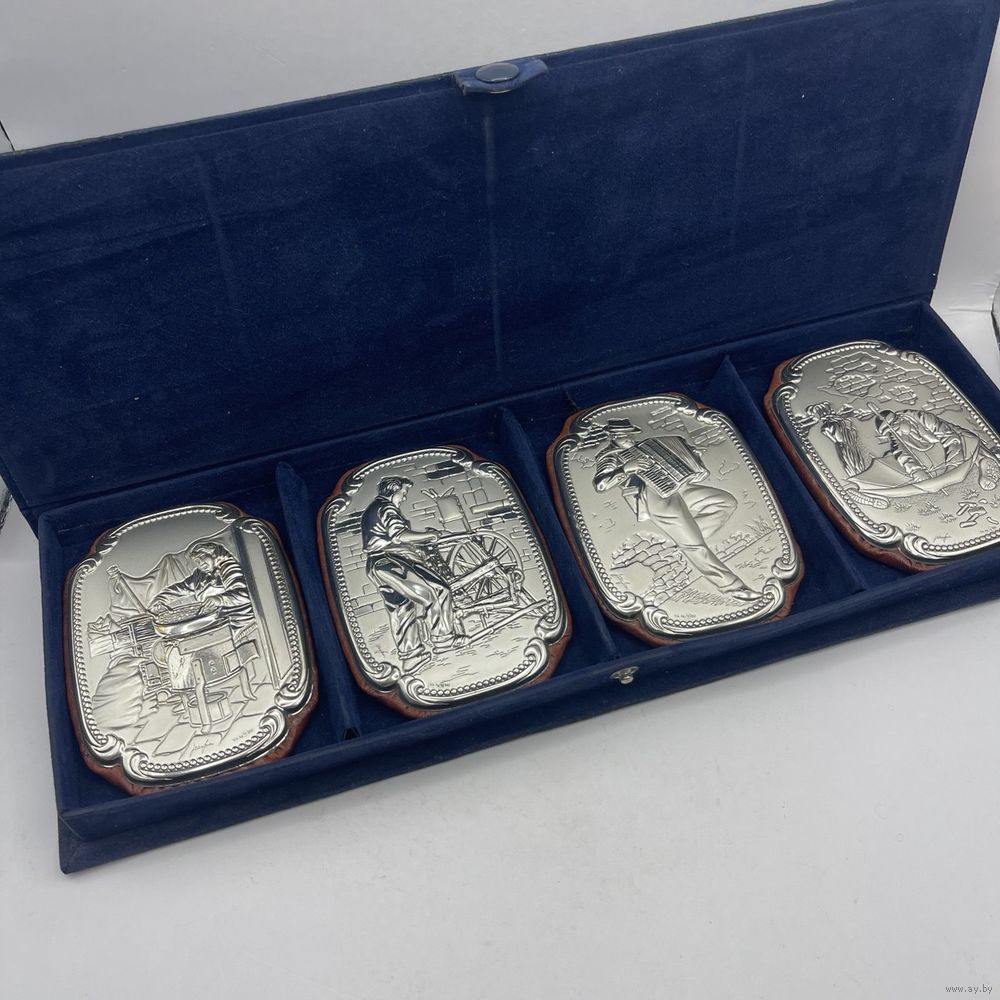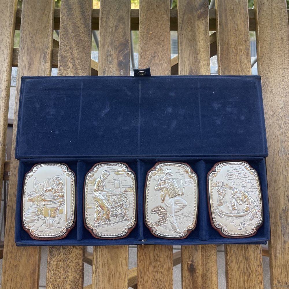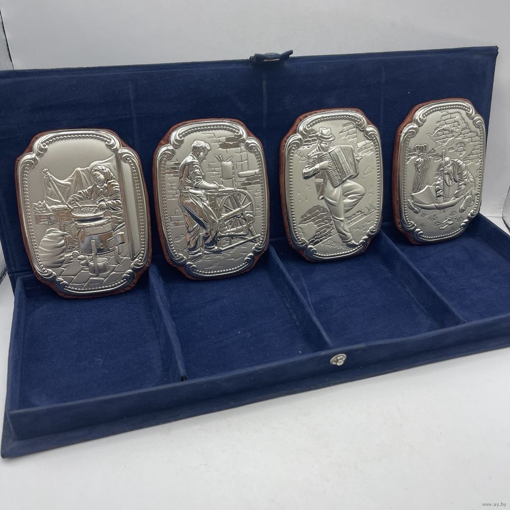 Винтажные миниатюрные барельефы ручной работы с ремесленными сюжетами в оригинальном бархатном кейсе с отдельными ячейками. Каждая миниатюра ламинирована 1 г серебра 850 пробы (NA Ag 1g 850). Тонкая ювелирная работа с подписью ювелира. Италия. 1980-е г.г. Клейма. Обратная сторона обтянута натуральной кожей. С отверстиями для настенного размещения. Размер 7,5 х 10,5 см. Размер кейса 35,5 х 12 х 2,5 см. В наборе 4 шт. Естественная патина.