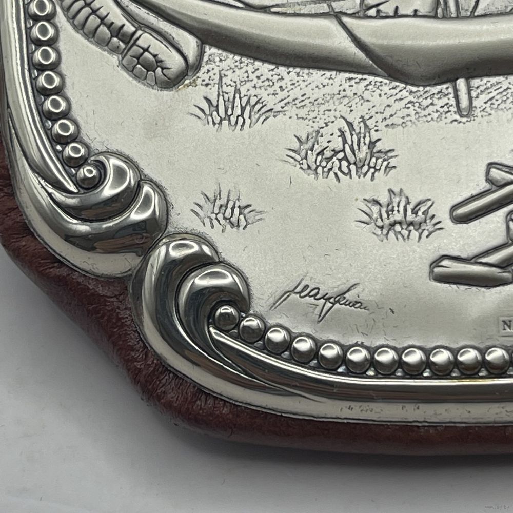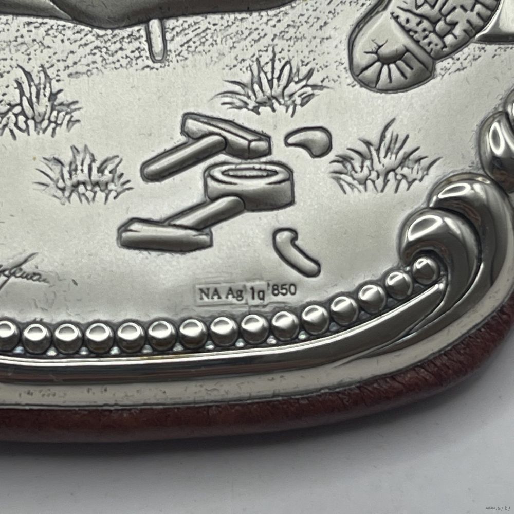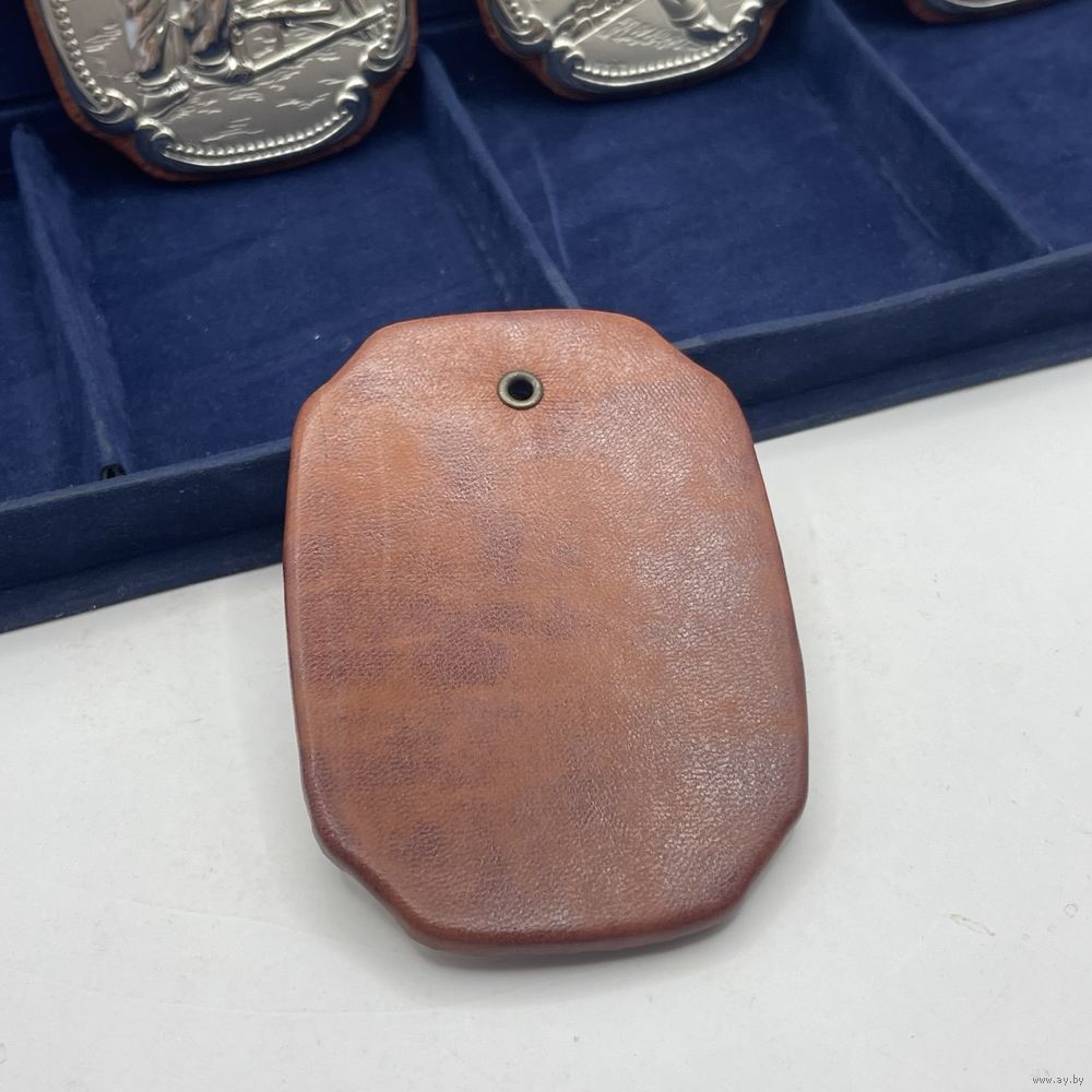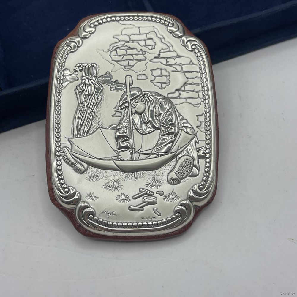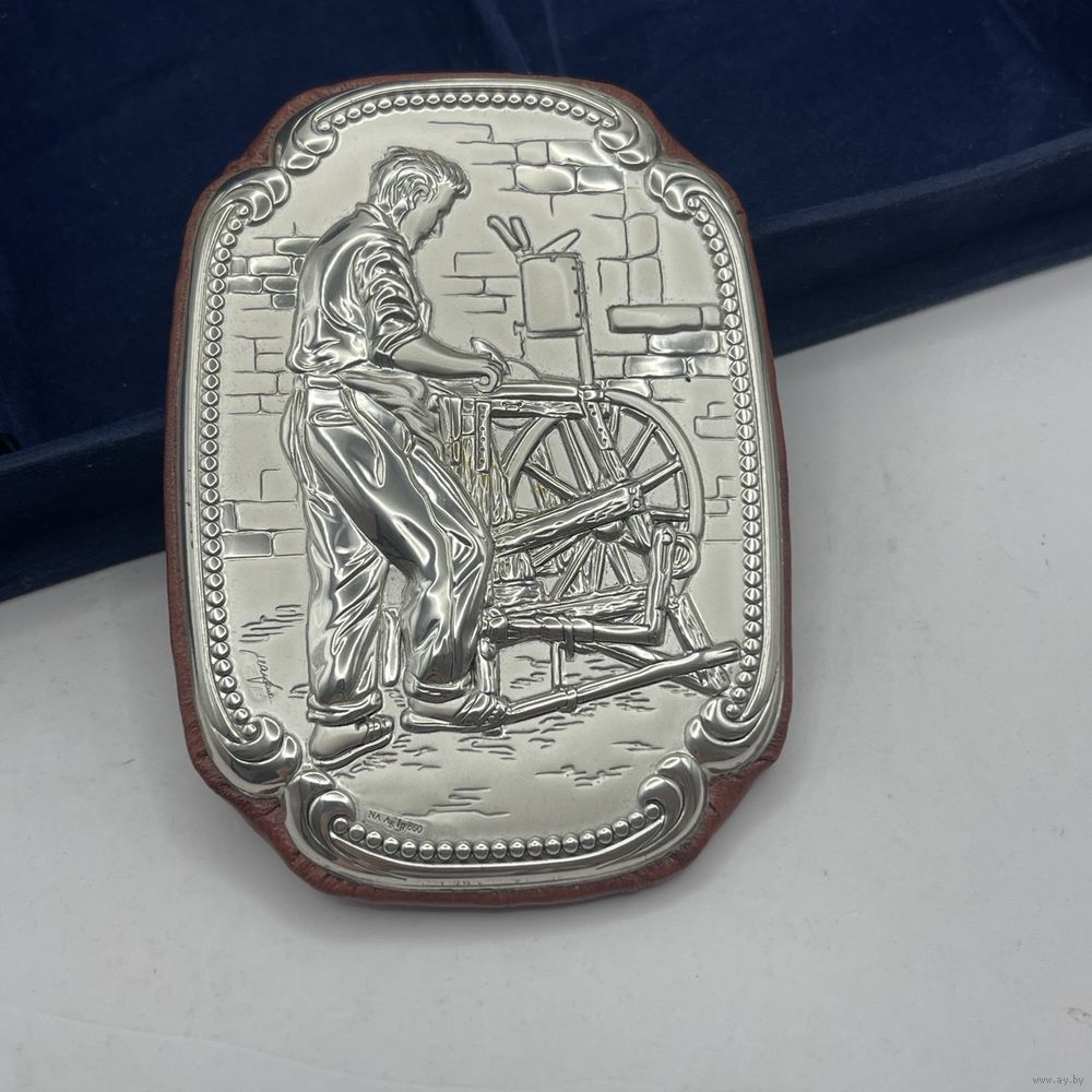 Винтажные миниатюрные барельефы ручной работы с ремесленными сюжетами в оригинальном бархатном кейсе с отдельными ячейками. Каждая миниатюра ламинирована 1 г серебра 850 пробы (NA Ag 1g 850). Тонкая ювелирная работа с подписью ювелира. Италия. 1980-е г.г. Клейма. Обратная сторона обтянута натуральной кожей. С отверстиями для настенного размещения. Размер 7,5 х 10,5 см. Размер кейса 35,5 х 12 х 2,5 см. В наборе 4 шт. Естественная патина.