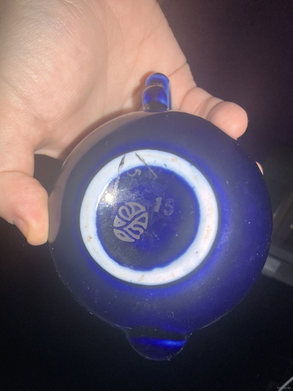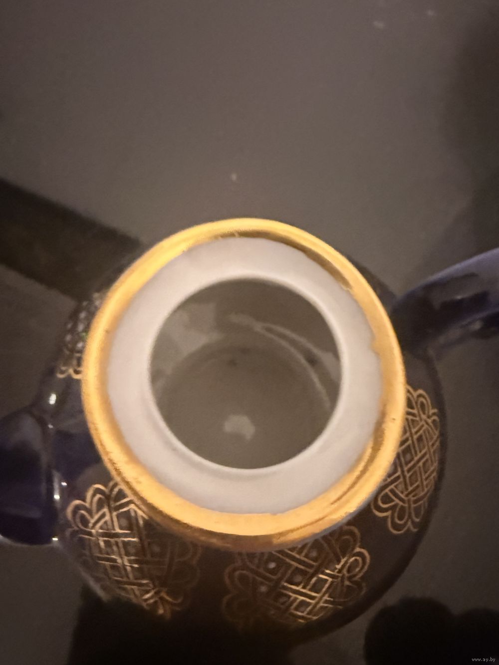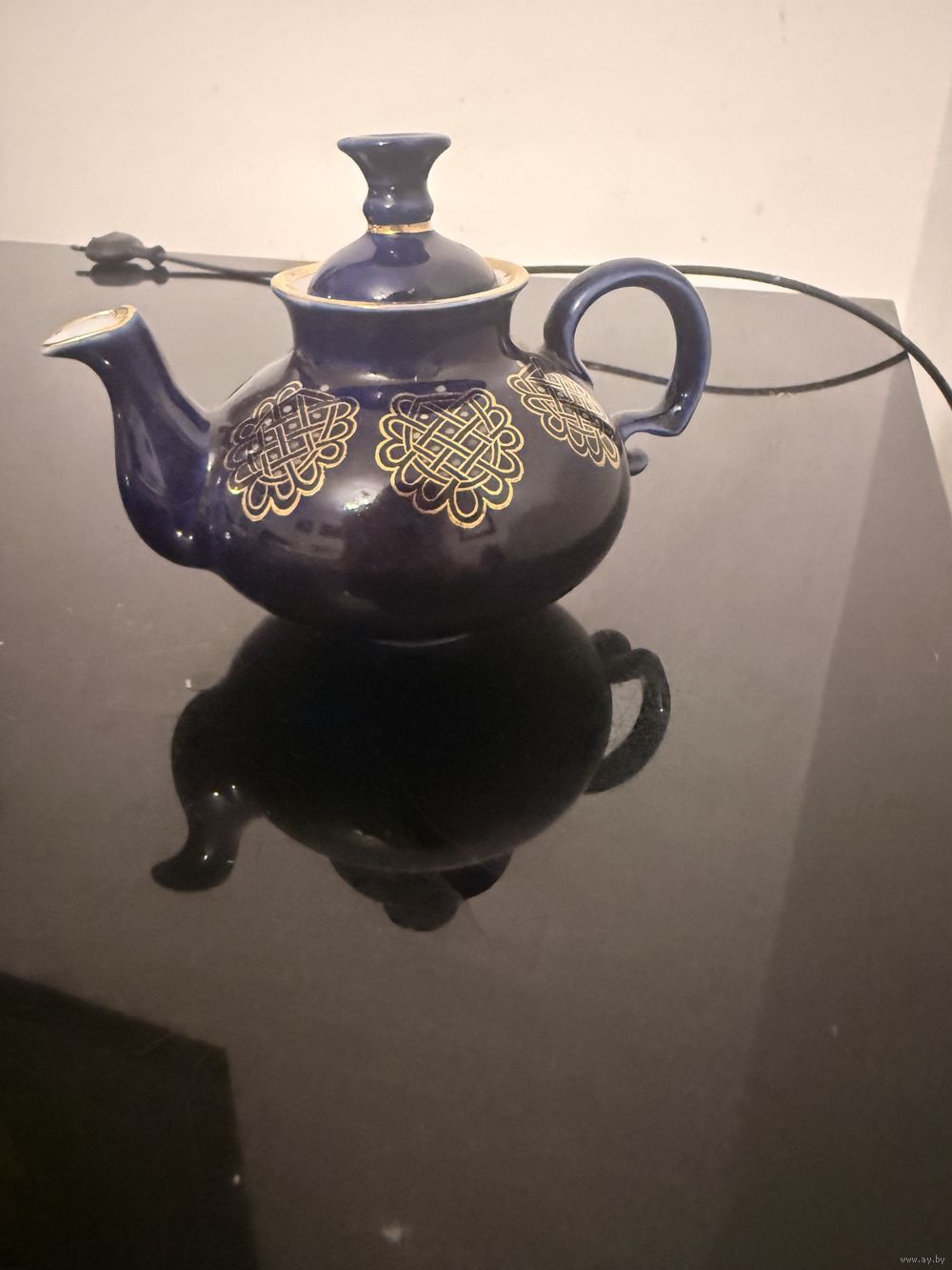 Миниатюрный чайник для зaваpки, фaрфор, кобaльт, ручнaя роспиcь золoтом. Oбъeм 165 мл, выcoтa бeз кpышки - 7 см,