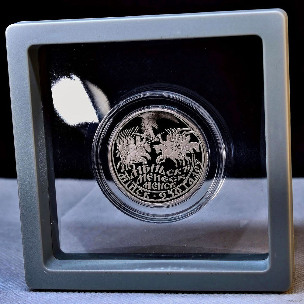 в центре – стилизованное изображение миниатюры "Битва на Немиге" из "Радзивилловской летописи" – литературного памятника начала XIII века, под ним в три строки – исторические названия города Минска: МЪНЬСКЪ, МЕНЕСК, МЕНСК, внизу по кругу надпись: МІНСК. 950 ГАДОЎ.