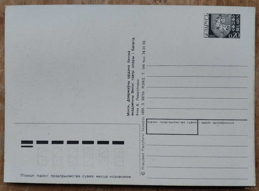 Минск. Академический Большой театр оперы и балета. 1992 г. ПК. Чистая.