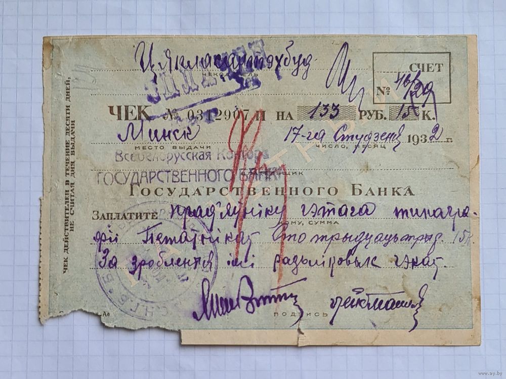 МИНСК. ЧЕК 132 РУБЛЯ 1932 г.