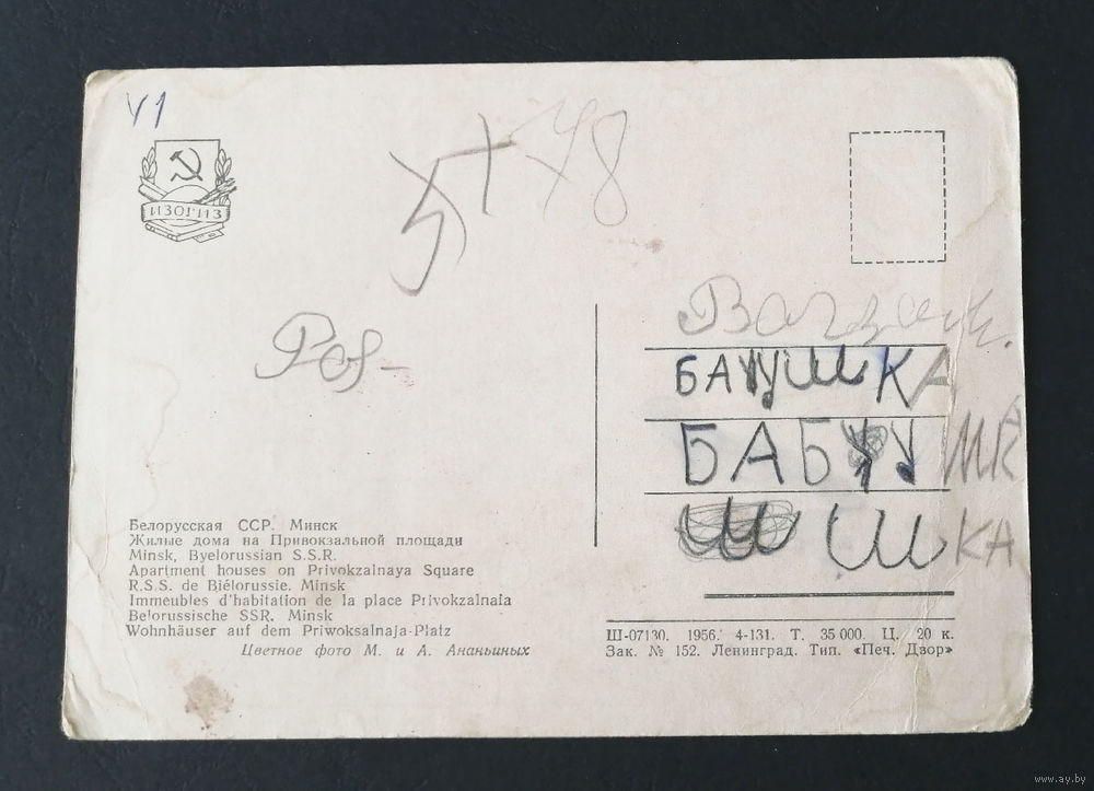 Минск. Привокзальная Площадь. Белорусская ССР. Виды городов. Пейзажи. ИЗОГИЗ 1956 год #0232-V2P116