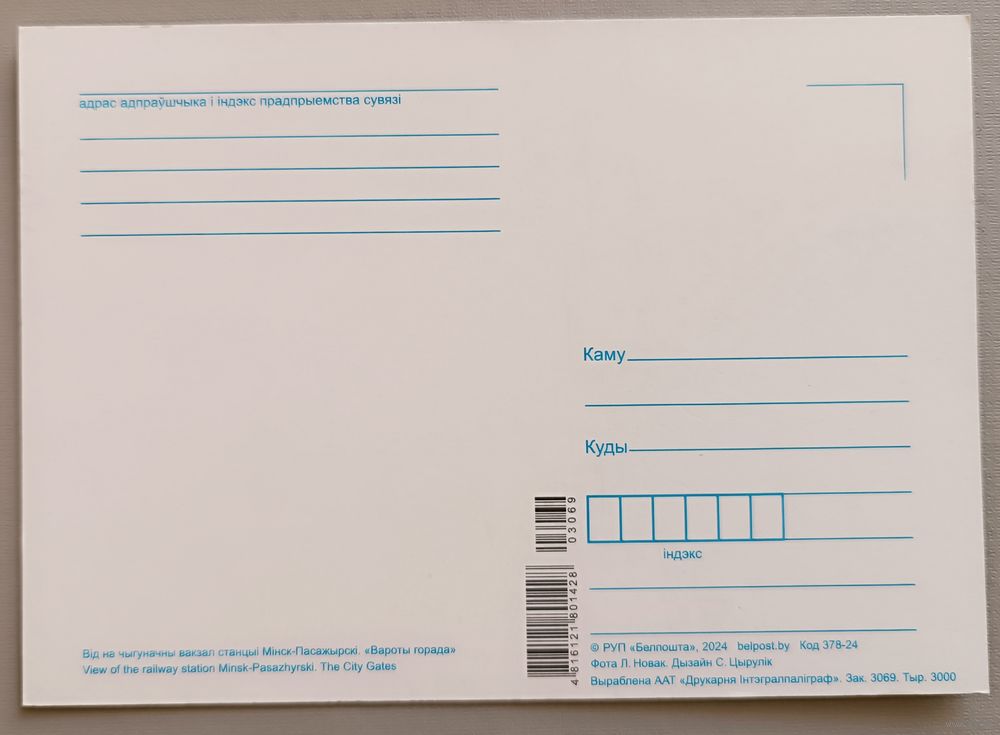 Минск. Вид на ж/д вокзал. "Ворота города". Открытка
