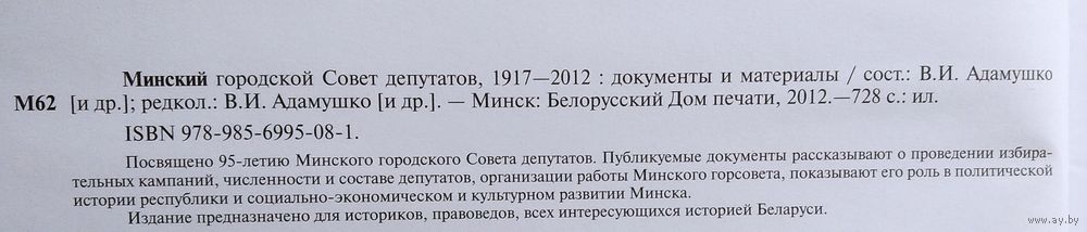 Минский городской Совет депутатов, 1917-2012: документы и материалы. Департамент по архивам и делопроизводству Министерства юстиции Республики Беларусь [и др. - Минск : Белорусский Дом печати, 2012 г. 727 с. Твердый переплет. Энц. формат.