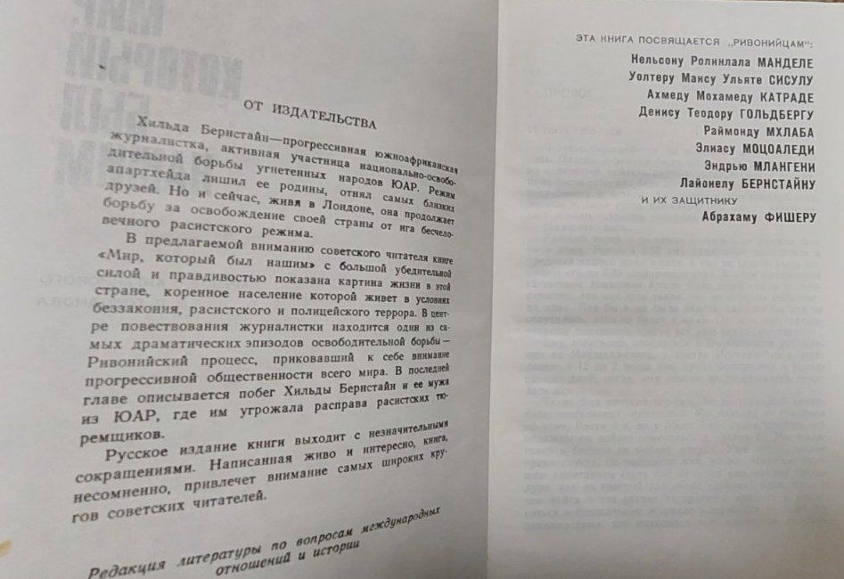 Мир, который был нашим посвящён «людям Ривонии» — Нельсону Манделе, Уолтеру Сисулу, Ахмеду Катраде, Денису Голдбергу, Говану Мбеки, Элиасу Мотсоаледи, Эндрю Млангени и Расти Бернштейну, а также их преданному адвокату Браму Фишеру.