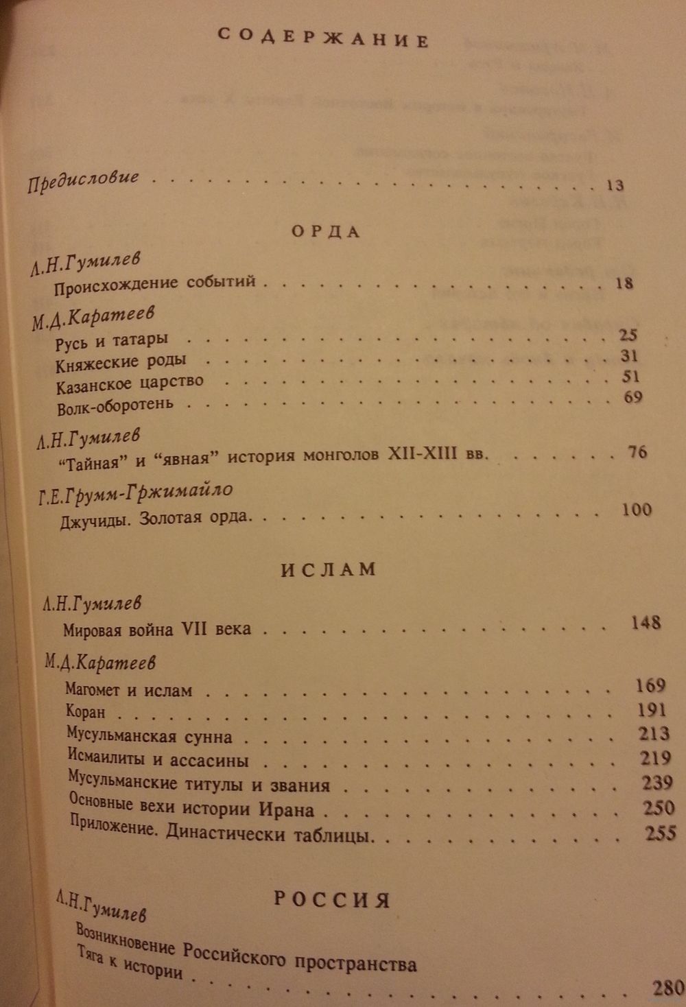 ОРДА (Л.Н.Гумилев - Происхождение событий - Тайная и явная история монголов XII-XIII вв. М.Д.Каратеев - Русь и татары - Княжеские роды - Казанское царство - Волк-оборотень. Г.Е.Грум-Гржимайло - Джучиды - Золотая орда). ИСЛАМ (Л.Н.Гумилев - Мировая война VII века. М.Д.Каратеев - Магомет и ислам - Коран - Мусульманская сунна - Исмаилиты и ассасины - Мусульманские титулы и звания - Основные вехи истории Ирана - Династические таблицы). РОССИЯ (Л.Н.Гумилев - Возникновение Российского пространства. М.И.Артамонов - Хазары и Русь. А.Н.Иванов - Тмутаракань в истории Вост.Европы Х века. И.Гаспринский - Русско-восточное соглашение - Русское мусульманство. Н.Н.Карамзин - Город Иргиз - Город мертвых).
