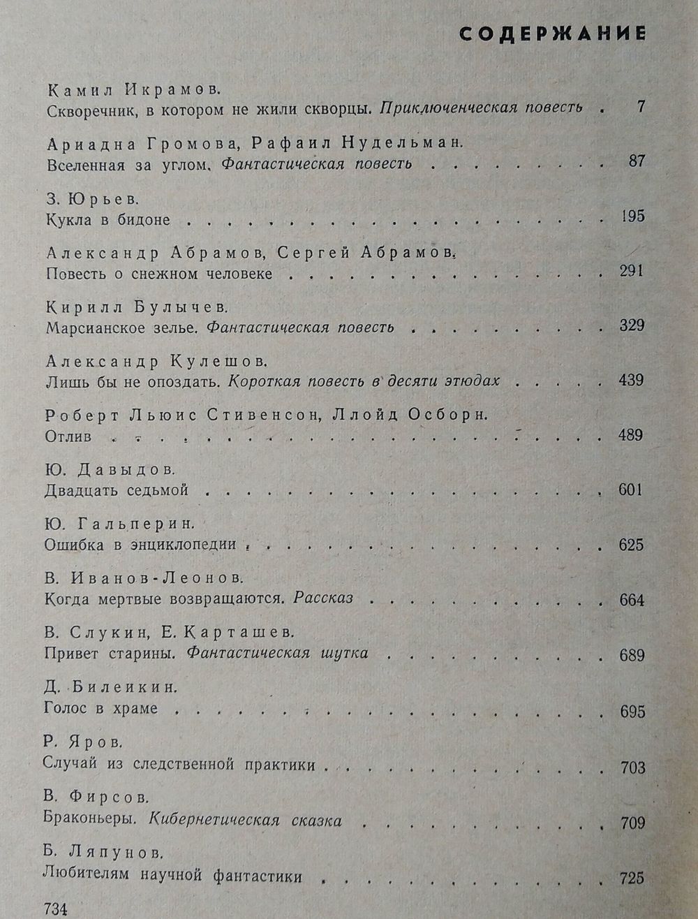Содержание: Камил Икрамов. Скворечник, в котором не жили скворцы. Ариадна Громова, Рафаил Нудельман. Вселенная за углом. З. Юрьев. Кукла в бидоне. Александр Абрамов, Сергей Абрамов. Повесть о снежном человеке. Кирилл Булычев. Марсианское зелье. Александр Кулешов. Лишь бы не опоздать. Роберт Льюис Стивенсон и Ллойд Осборн. Ю. Давыдов. Двадцать седьмой. Ю. Гальперин. Ошибка в энциклопедии. В. Иванов-Леонов. Когда мертвые возвращаются. В. Слукин, Е. Карташев. Привет старины. Д. Биленкин. Голос в храме. Р. Яров. Случай из следственной практики. В. Фирсов. Браконьеры. Б. Ляпунов. Любителям научной фантастики (статья).