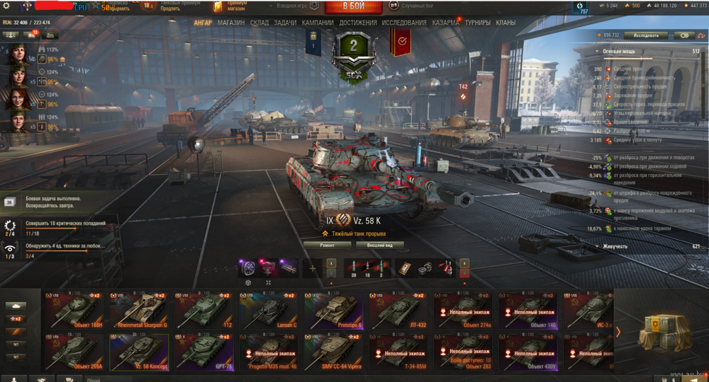 8 ур. (32): Об. 274а, Об. 703 Вариант 2, Scorpion G, SMV CC-64 Vipera, ЛТ-432, Об. 168Н, ИС-3 с МЗ, ИС-6, E 75 TS, Lowe, VK 168.01 P, AMBT, M47 Patton Improved, T26E4 SuperPershing, Chrysler K, Chrysler K GF, M54 Renegade, TS-5, Lorraine 40t, M4A1 Revalorise, Chieftain/T95, Taurus CA, Skoda T56, CS-52 LIS, 122 TM, T-34-3, WZ-120-1G FT, Lansen C, Progetto M35 mod. 46, Bisonte C45, Об. 259А, 112
