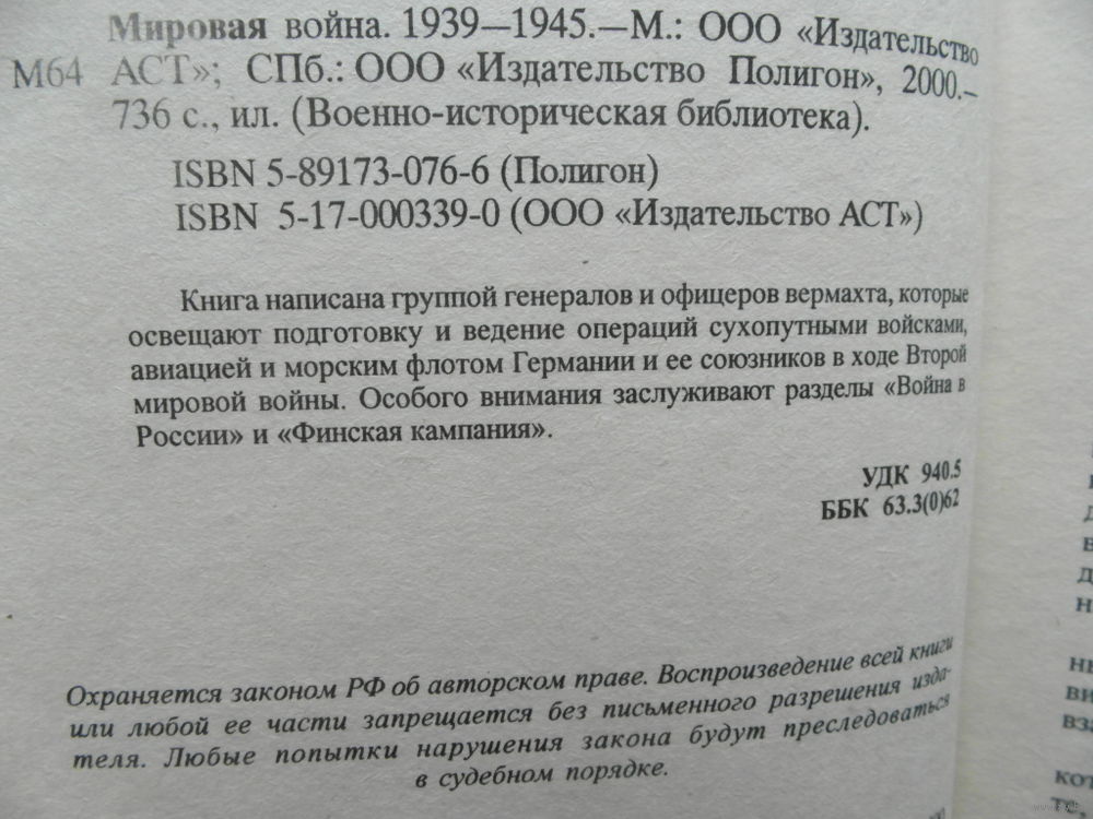 Сразу же после победы над Германией американское командование привлекло большую группу бывших гитлеровских генералов и офицеров для подготовки исследований по истории Второй мировой войны. Данная книга является одним из таких исследований. Во всех трех частях – `Война на суше`, `Война на море` и `Война в воздухе` – содержится много фактического материала. Авторы принимали непосредственное участие в боевых действиях, занимая должности, которые позволяли им многое знать и видеть, поэтому их оценка ошибок и промахов, допущенных германским военным руководством во Второй мировой войне, а также выводы на будущее представляют интерес для широкого круга читателей.