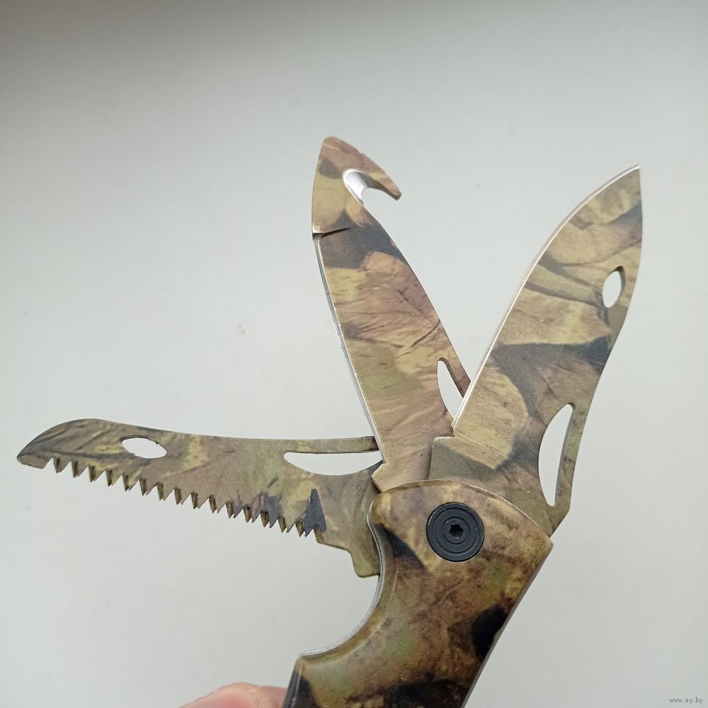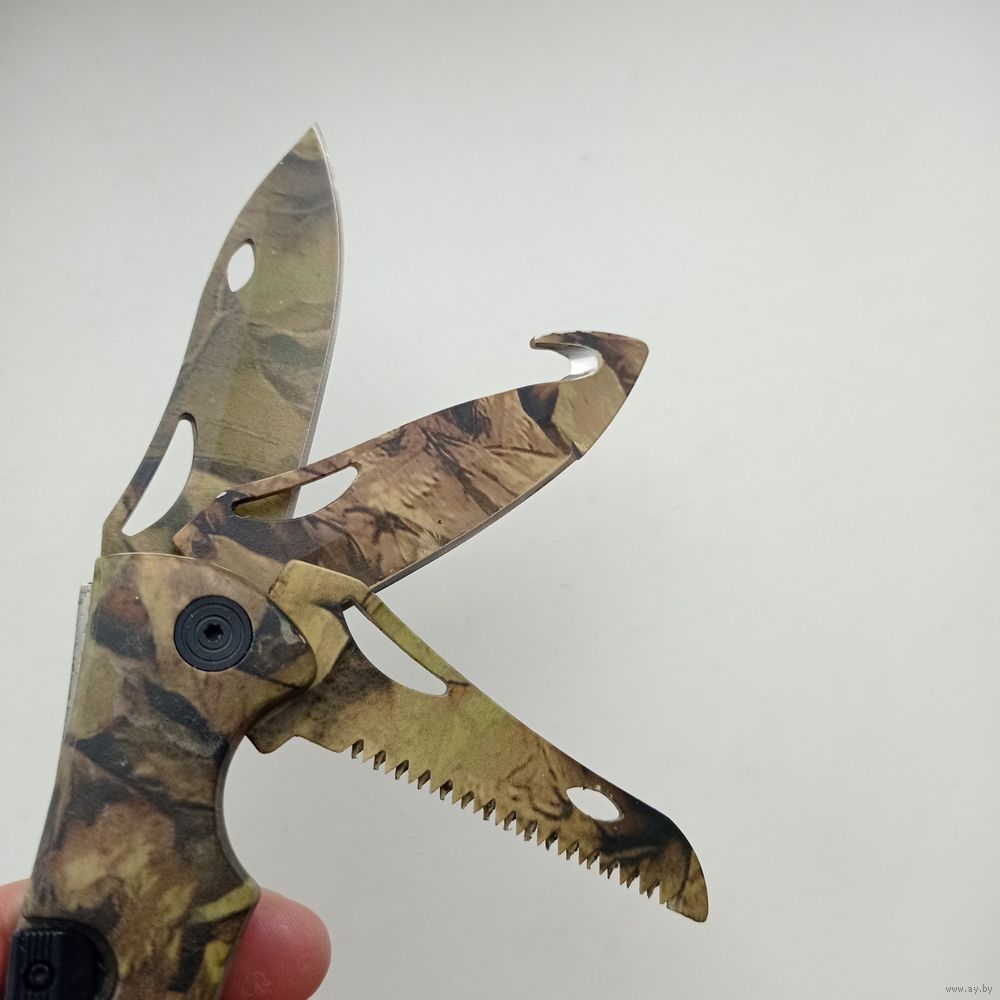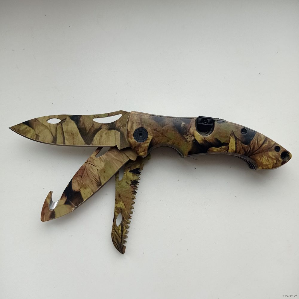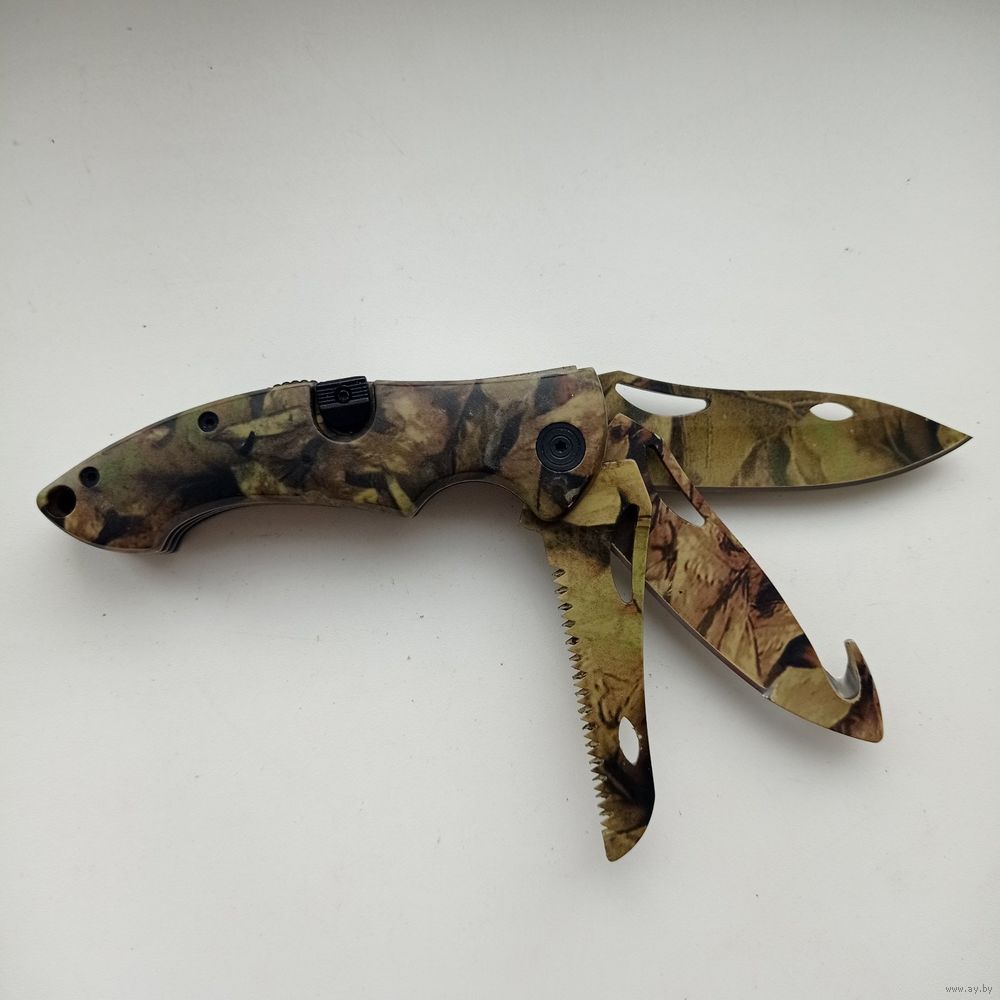 Многофункциональный складной нож три в одном с камуфляжной расцветкой рукояти и лезвий.
