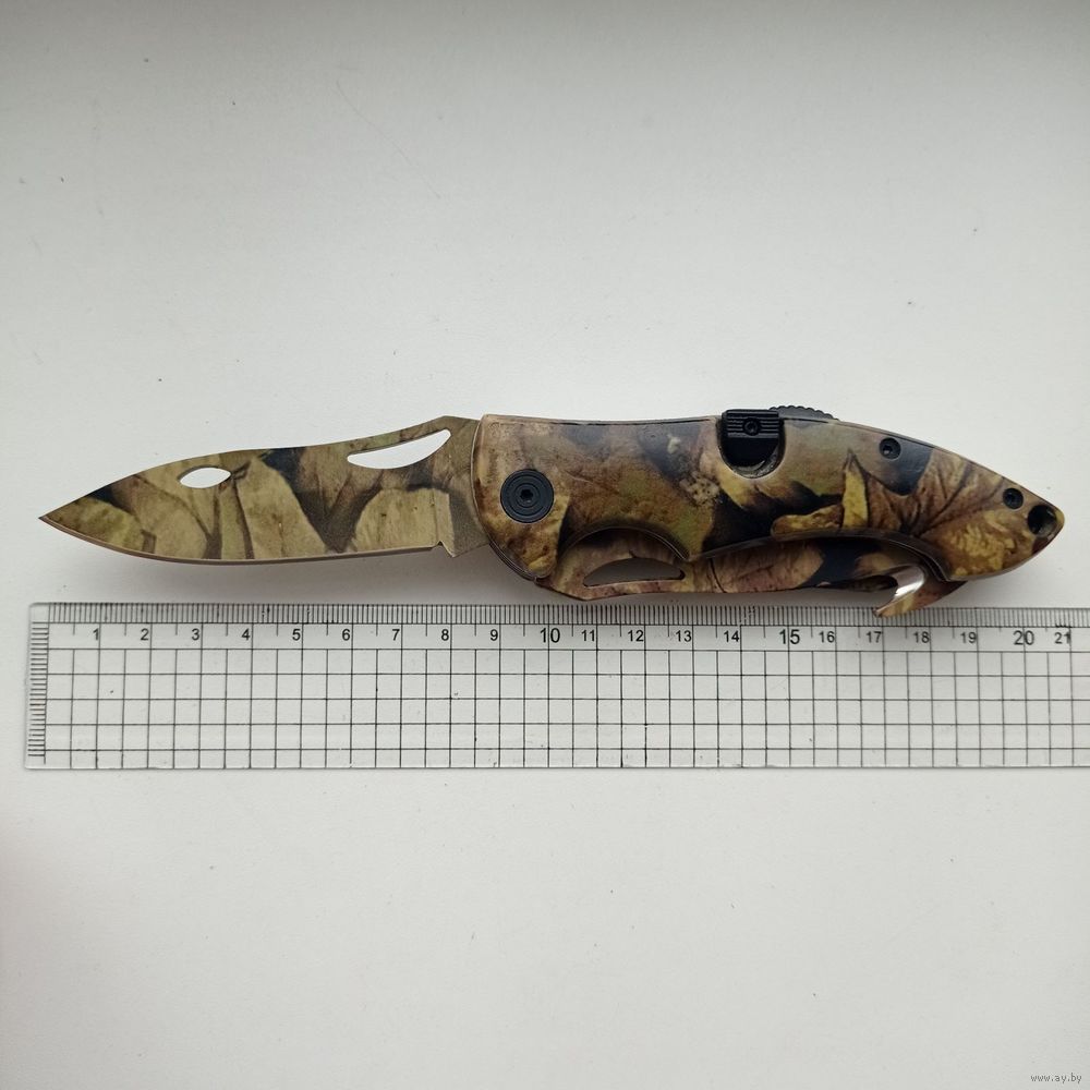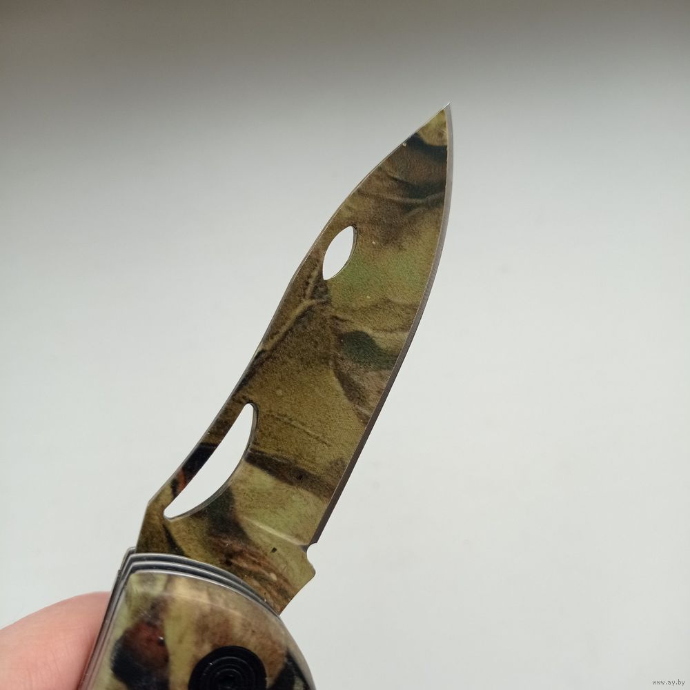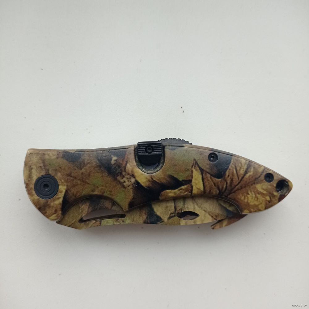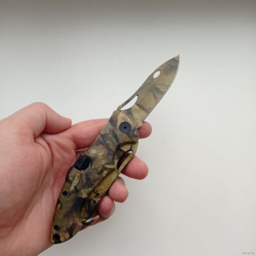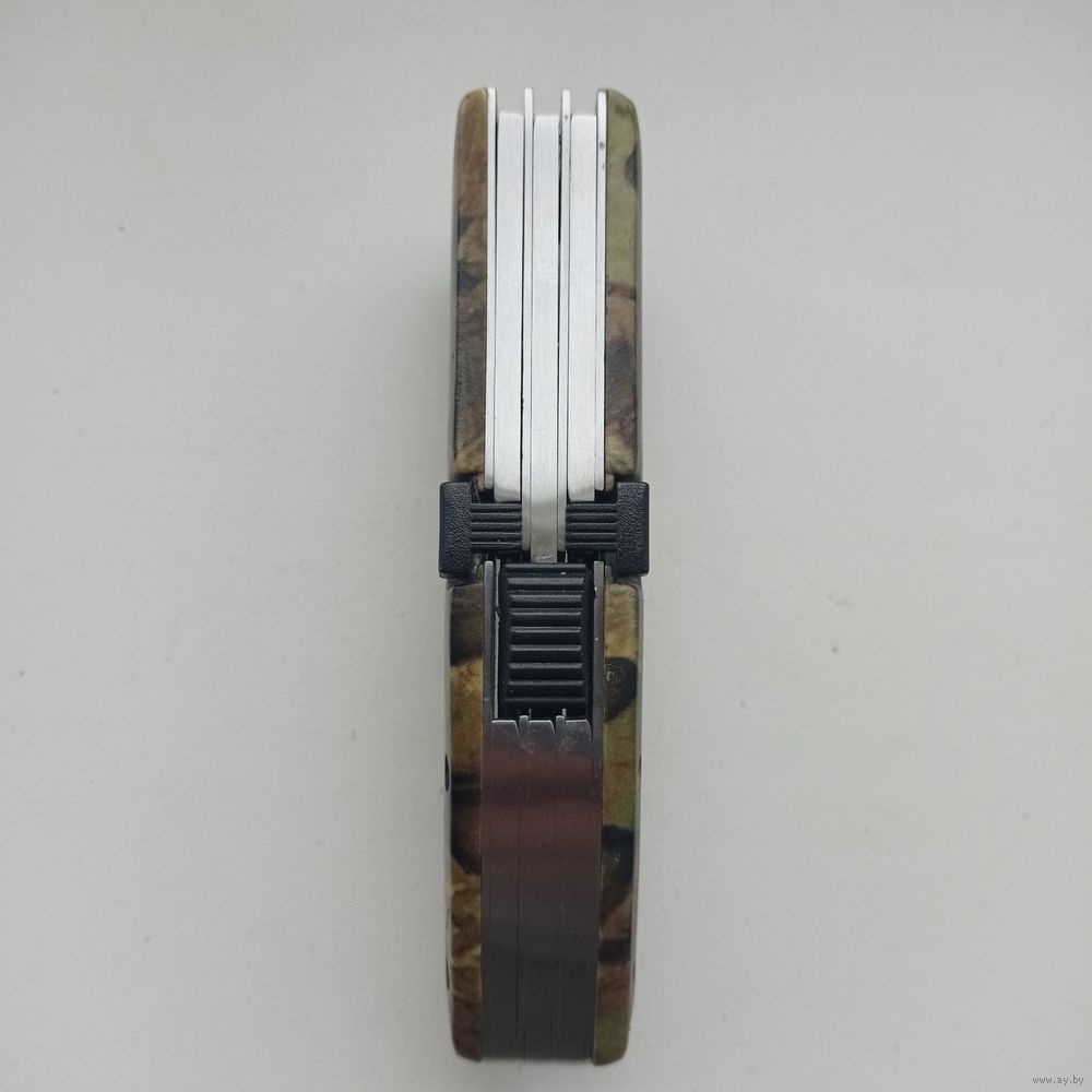 Многофункциональный складной нож три в одном с камуфляжной расцветкой рукояти и лезвий.