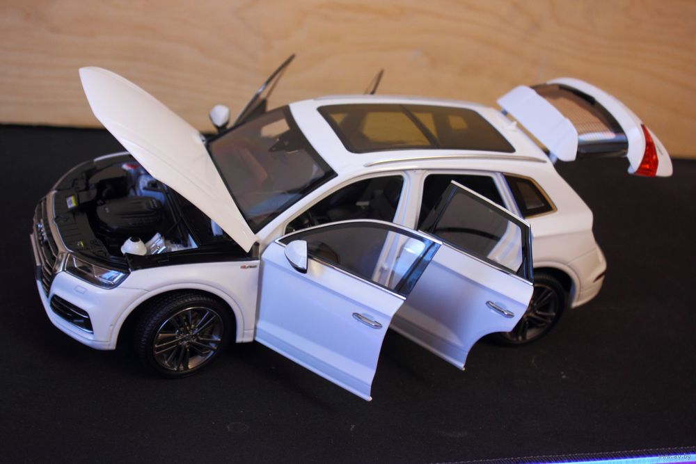 Модель Audi Q5L, масштаб 1:18. Немного помята картонная коробка, модель в отличном состоянии. Хороший функционал: открываются двери, багажник, капот, рабочая подвеска, руль связан с поворотными колесами, передние сидения двигаются вперед и назад. Почта за счет покупателя.