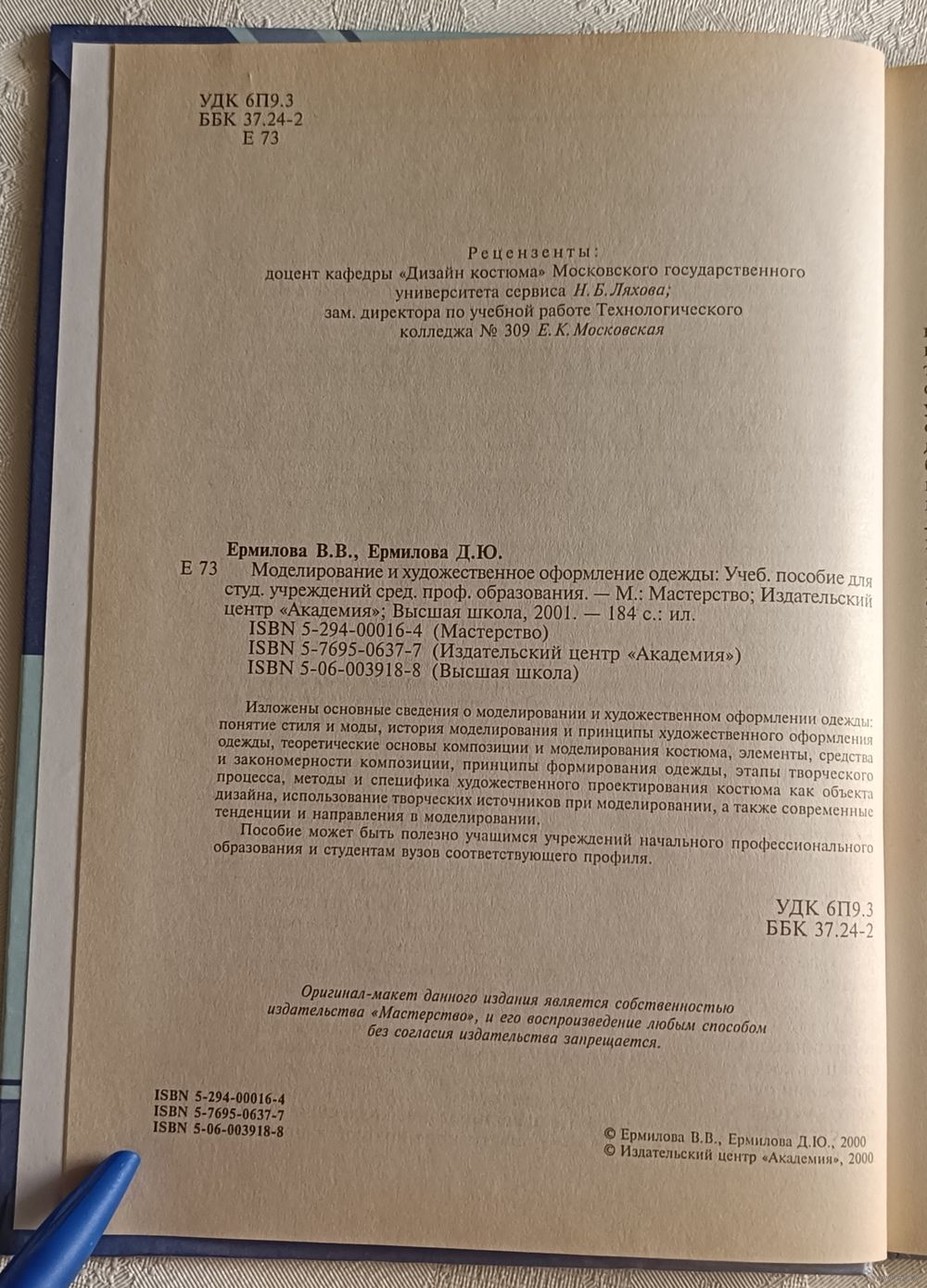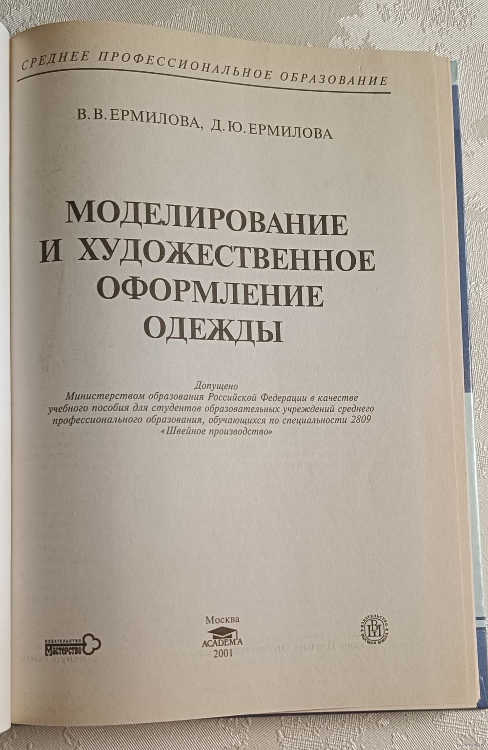Ермилова В.В., Ермилова Д.Ю. Моделирование и художественное оформление одежды: Учеб. пособие для студ. учреждений сред. проф. образования. М.: Мастерство; Издательский центр «Академия»; Высшая школа, 2001. — 184 с.: ил., твёрдый переплёт, увеличенный формат.