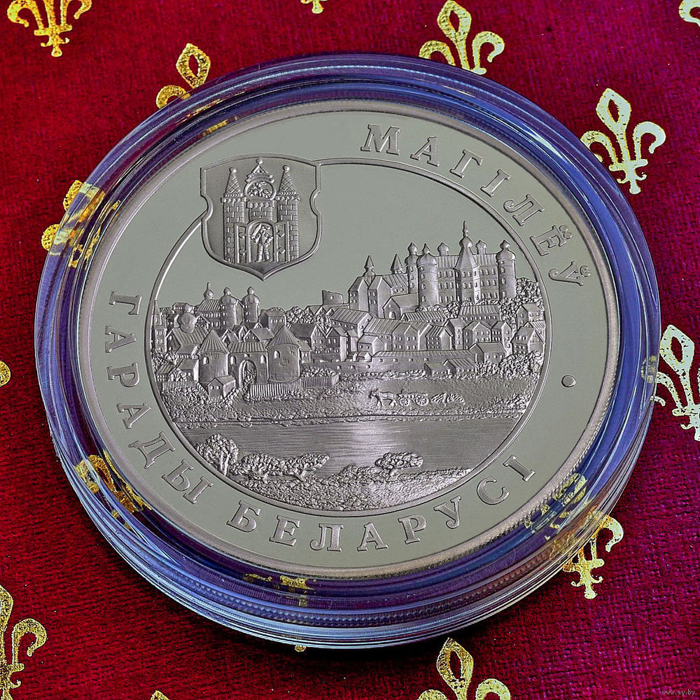 в центре – рельефное изображение панорамы Могилева с гравюры XVIІІ века, слева вверху – рельефное изображение герба г. Могилева; по кругу надписи: вверху – "МАГІЛЁЎ", внизу – "ГАРАДЫ БЕЛАРУСІ".