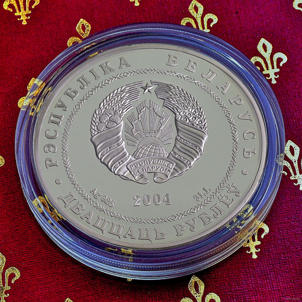 в круге, обрамленном геометрическим орнаментом, – рельефное изображение Государственного герба Республики Беларусь, под ним указаны год чеканки (на серебряной – масса драгоценного металла в чистоте и проба сплава); по кругу надписи: в верхней части – "РЭСПУБЛІКА БЕЛАРУСЬ", в нижней – "ДВАЦЦАЦЬ РУБЛЁЎ" – на серебряной и "АД3ІН РУБЕЛЬ" – на медно–никелевой.
