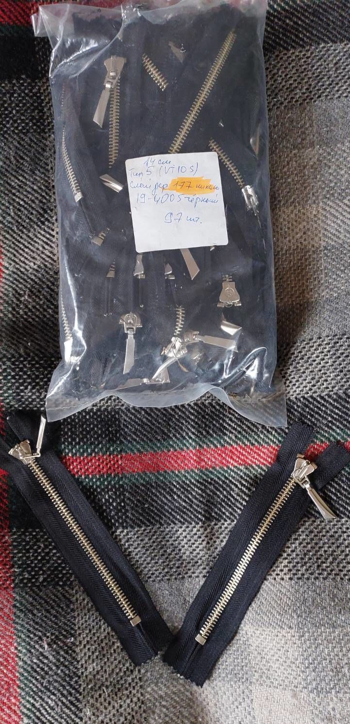 13. Молния 18 cм, цвет 0580/19-4005, черная основа, металлическая тип 5 неразъемная, звено corn, сл.31. Есть 31 шт. Цена: 3 руб/шт.