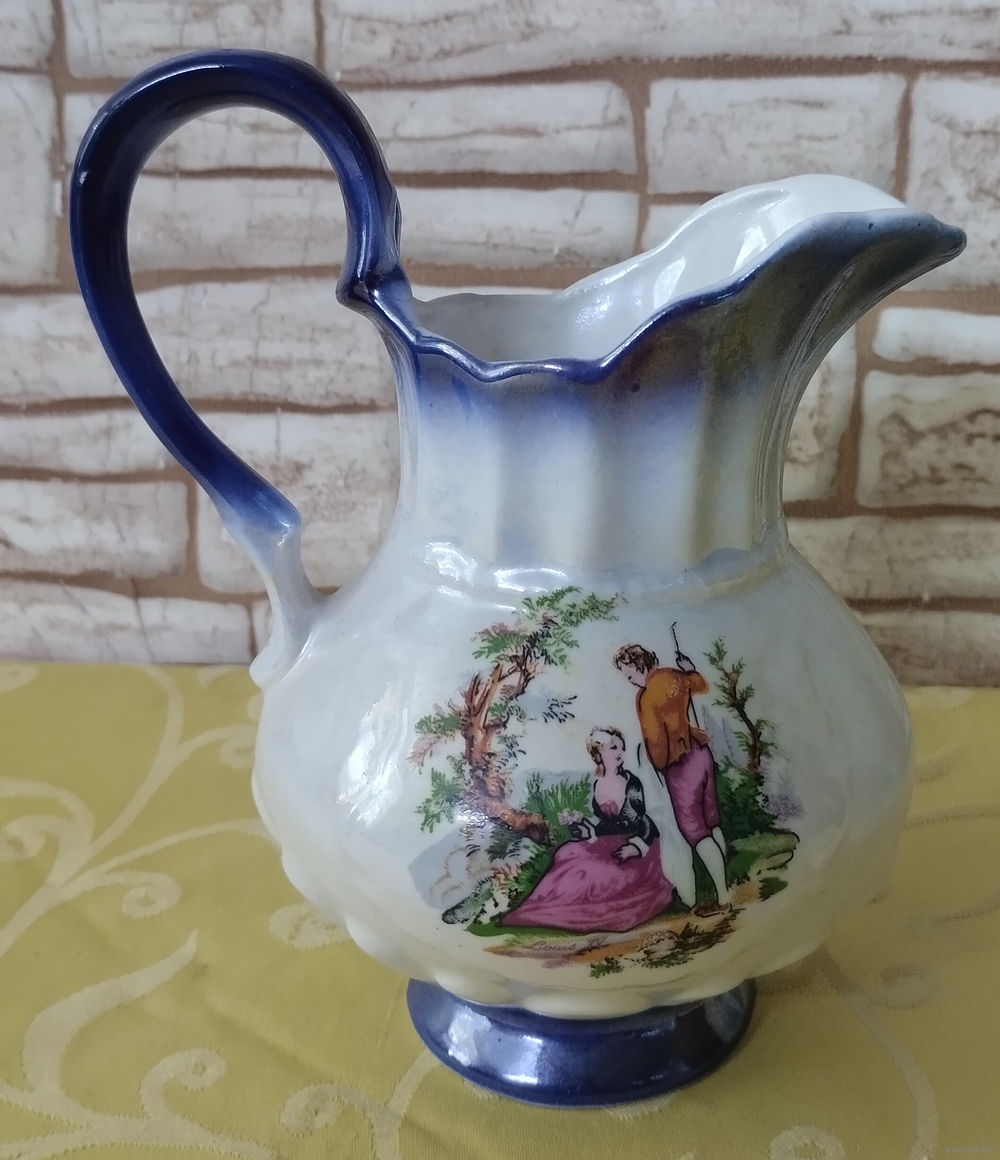 • Особенности: Ручная или декольная роспись с изображением пары в парке, подчеркнутая синей каймой на ручке и основании.