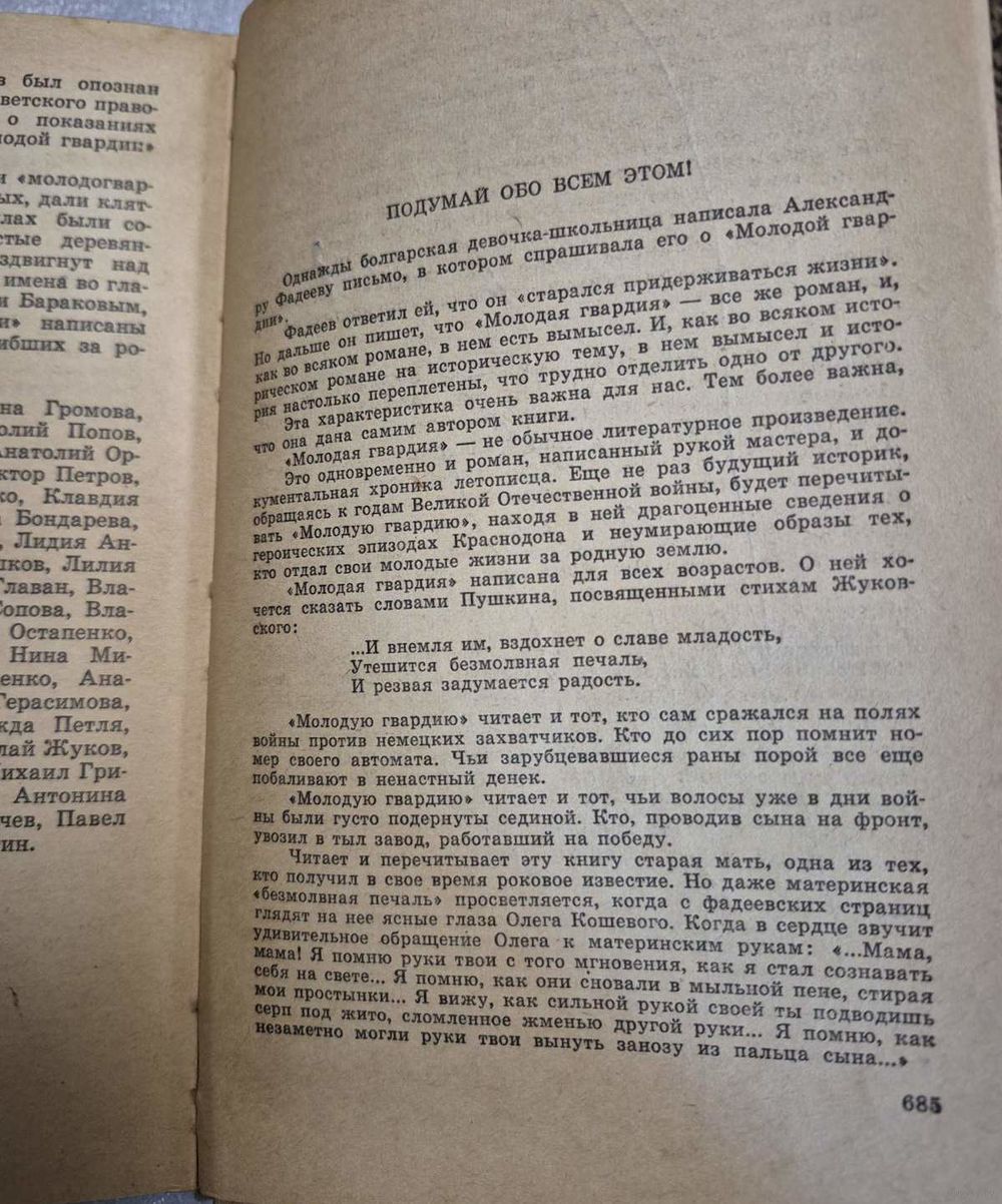 Знаменитая книга Александра Фадеева, посвящённая краснодонскому подполью, до конца 1980-х годов была обязательной для прочтения. Роман «Молодая гвардия» был вторым по издаваемости произведением детской литературы в СССР за 1918—1986 годы: общий тираж 276 изданий составил 26,143 млн экземпляров