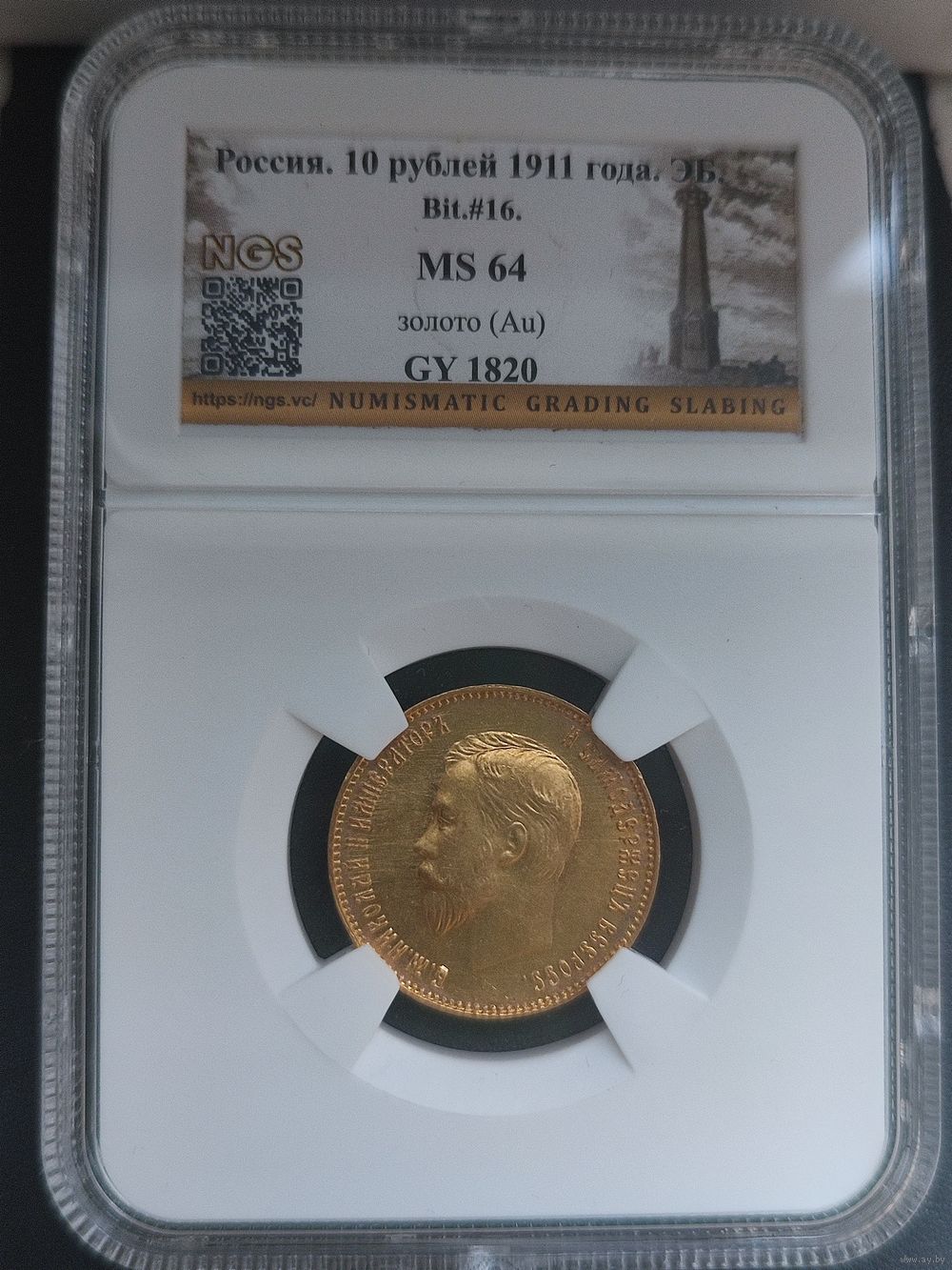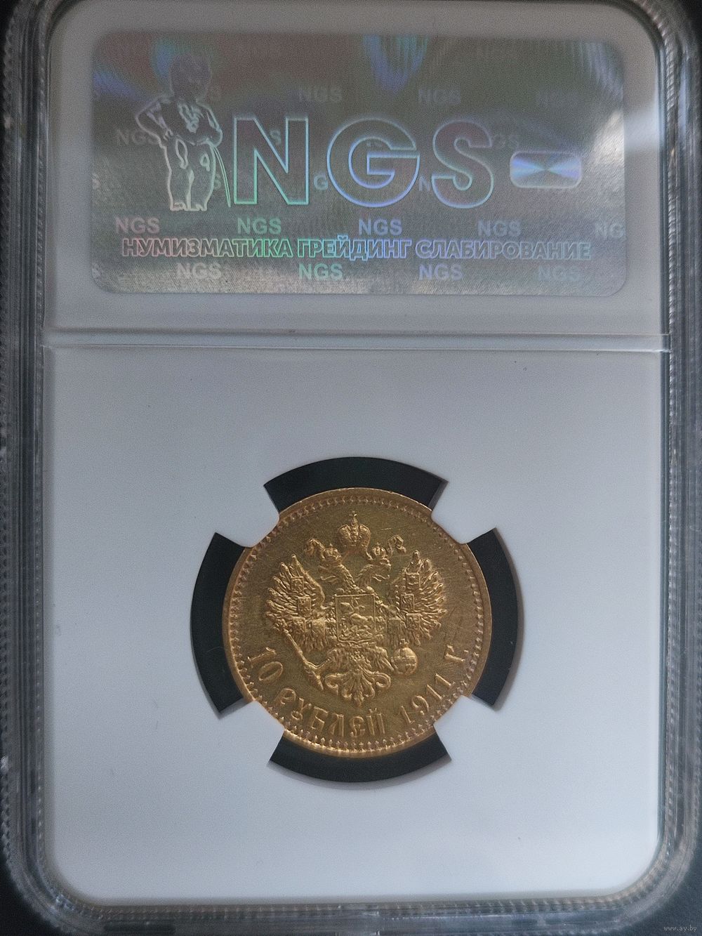 Монета 10р.1911г.(ЭБ) в слабе МS64. Золото.