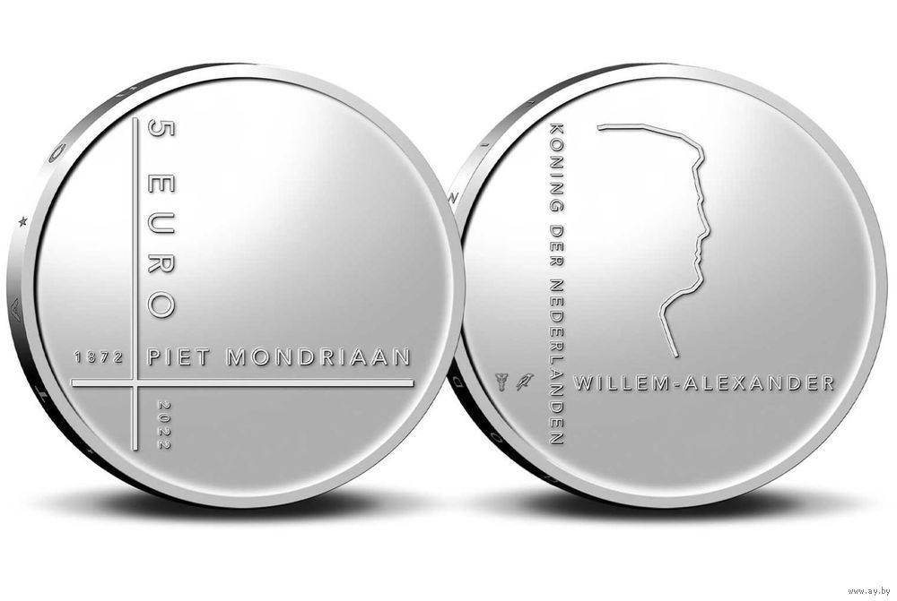 Дизайнер искала базовое воплощение видения Мондриана. Горизонтальные и вертикальные линии являются основными принципами в его работе, и поэтому они были использованы в качестве отправной точки при создании дизайна монеты. На аверсе изображен портрет короля Виллема-Александра. С левой стороны текст ‘Король Нидерландов’ сверху вниз. Внизу, слева направо, текст "Виллем-Александр". Два текста пересекают друг друга и, таким образом, создают такое же взаимодействие линий, какое мы знаем по Мондриану. Слева знак минцмейстера и главный знак монетного двора.