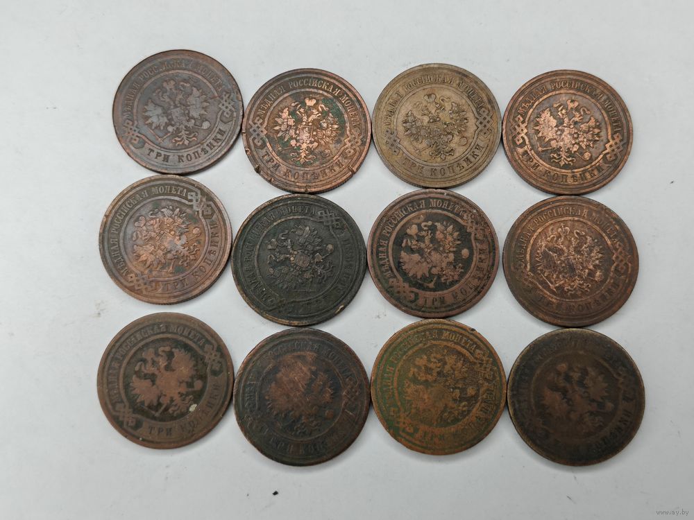 Монета 3 копейки 1867-1912 гг. Царизм. Одним лотом 12 монет. С рубля