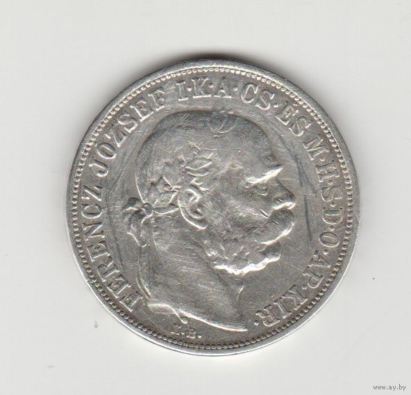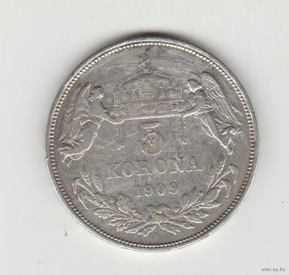 Монета 5 крон 1909 года. Австро-Венгрия. Серебро.