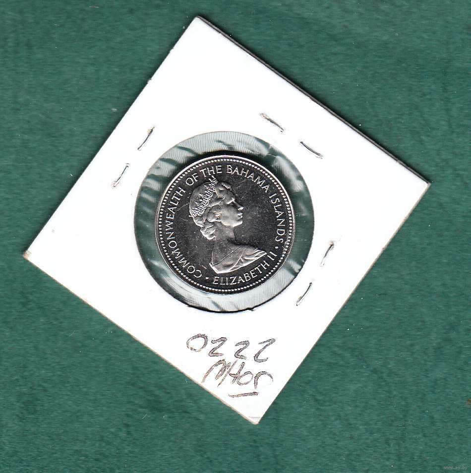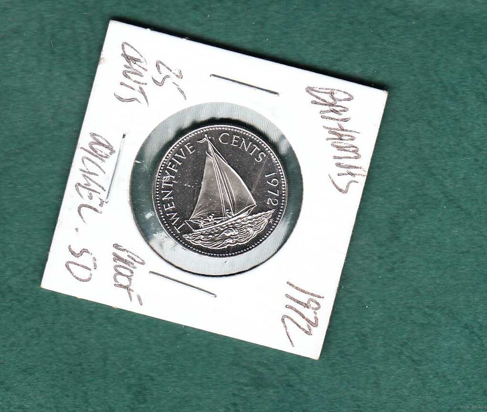 Монета Багамские острова 25 центов 1972 года, состояние отображено на скане.