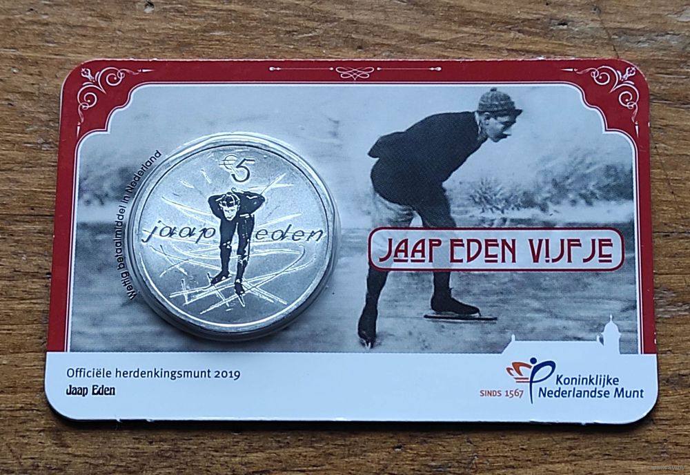 Jaap Eden 5 Евро был разработан художницей Винеке Гарц. Мы видим, как Яап Эден катается перед нами в манере великого чемпиона: сильный и непреклонный, но в то же время спокойный и естественный. Мы видим согнутую позу победителя, который идет своим путем, невзирая на ветер и непогоду, движимый желанием быть лучшим. Глубокие царапины на льду создают ощущение голландского пейзажа и символизируют впечатление, которое Яап Иден оставил как спортсмен.