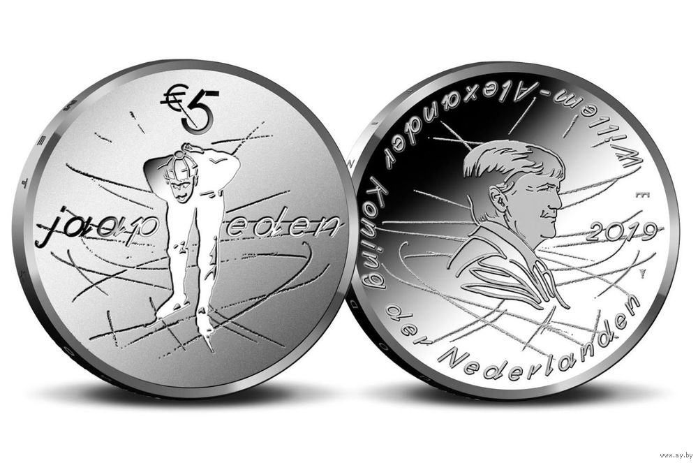 На аверсе мы видим царапины от коньков, отраженные на реверсе. Влияние Яапа Идена буквально отражается в настоящем. Рельефные царапины на глянцевом фоне образуют праздничный, сияющий фон для портрета короля Виллема-Александра.