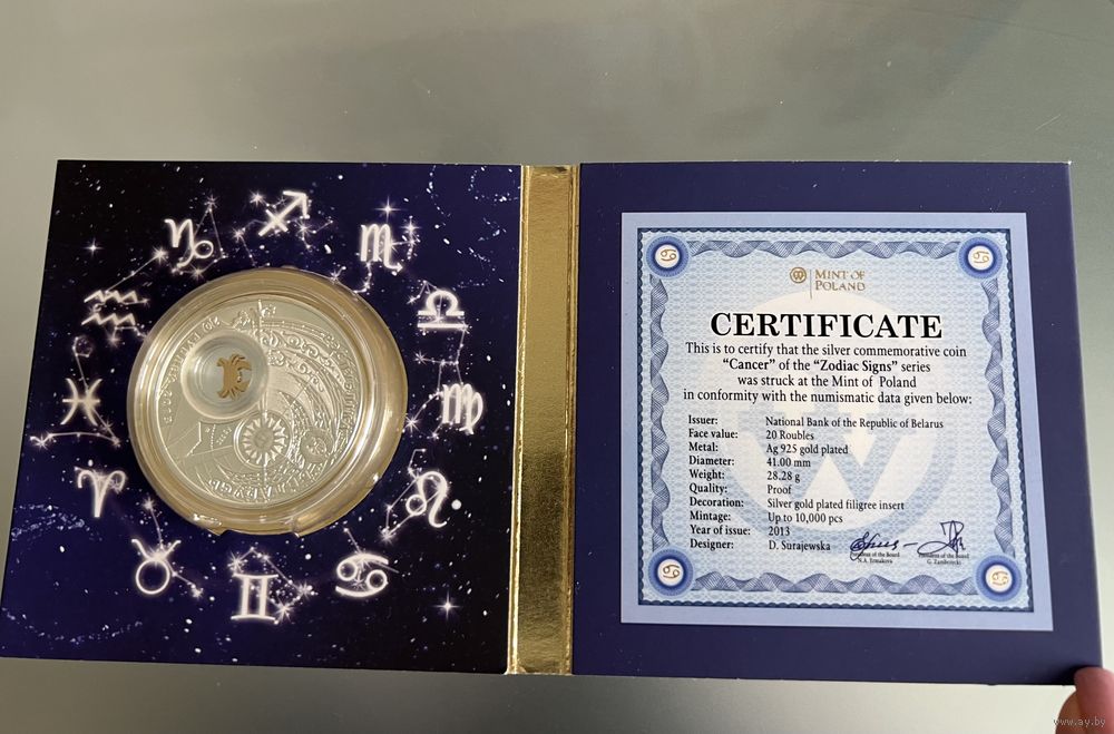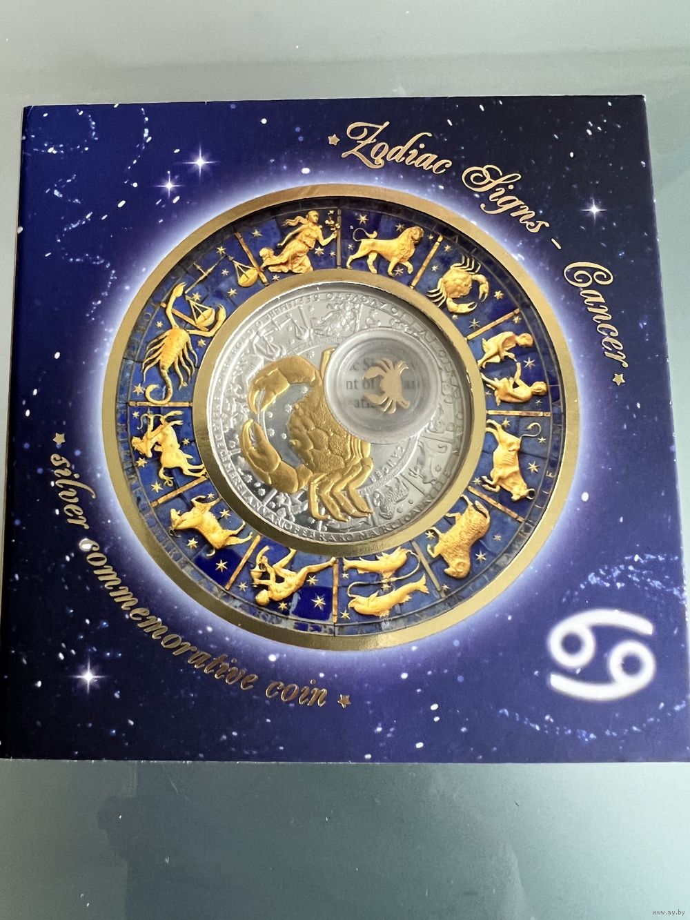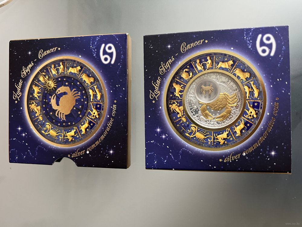 Очень красивая серебряная монета, РАК покрыт золотом, вес 28,28 грамм. Монета очень красивая, лимитированная коллекция. Рак маленький внутри монеты двигается.