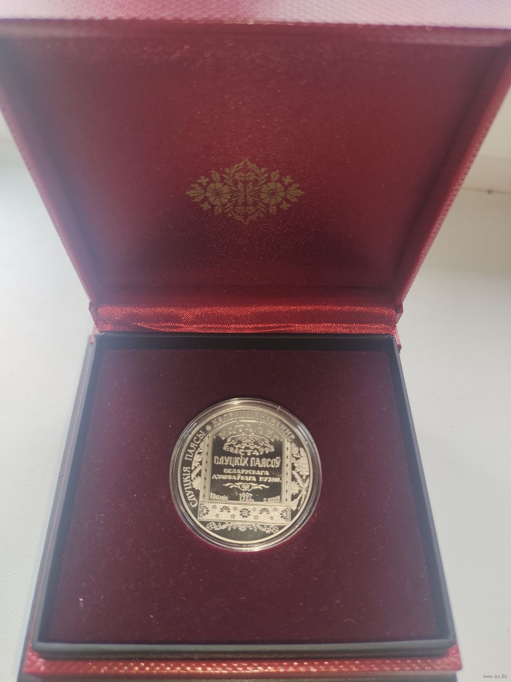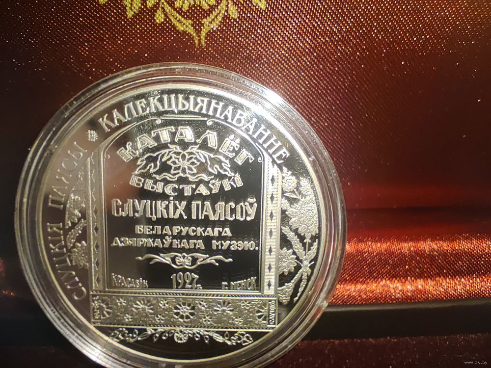 Вверху монеты – рельефное изображение Государственного герба Республики Беларусь; в центре монеты в круге – изображение фрагмента двухстороннего пояса, изготовленного на Слуцкой мануфактуре и находящегося в коллекции Литературного музея Максима Богдановича; по внешнему кругу вверху надпись: РЭСПУБЛІКА БЕЛАРУСЬ; слева – год чеканки, справа – художественный элемент, внизу – номинал: 1 РУБЕЛЬ.