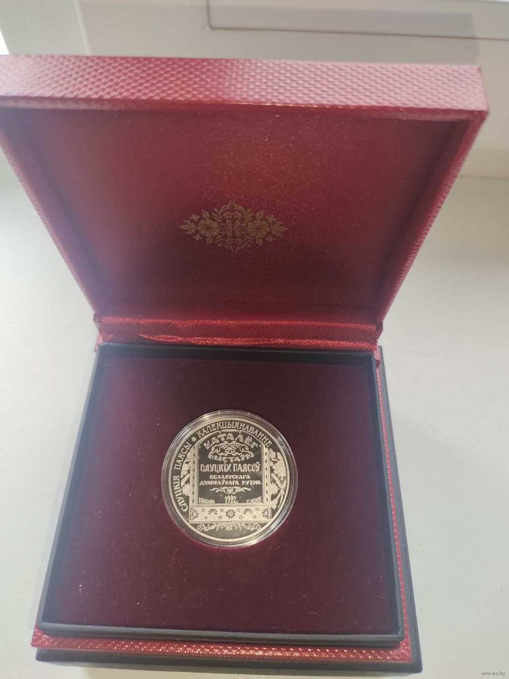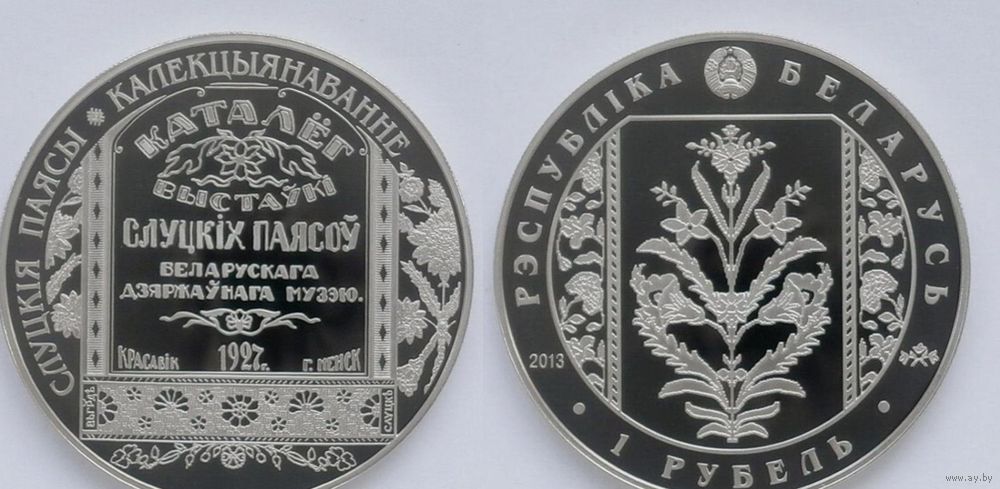 Вверху монеты – рельефное изображение Государственного герба Республики Беларусь; в центре монеты в круге – изображение фрагмента двухстороннего пояса, изготовленного на Слуцкой мануфактуре и находящегося в коллекции Литературного музея Максима Богдановича; по внешнему кругу вверху надпись: РЭСПУБЛІКА БЕЛАРУСЬ; слева – год чеканки, справа – художественный элемент, внизу – номинал: 1 РУБЕЛЬ.