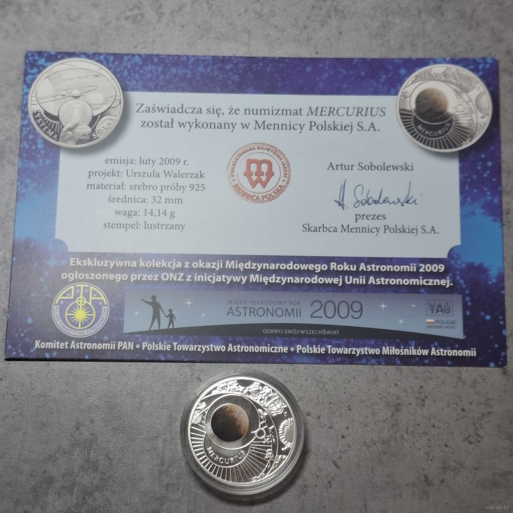 Монетовидный жетон из серии солнечная система, польский вариант серебро меркурий