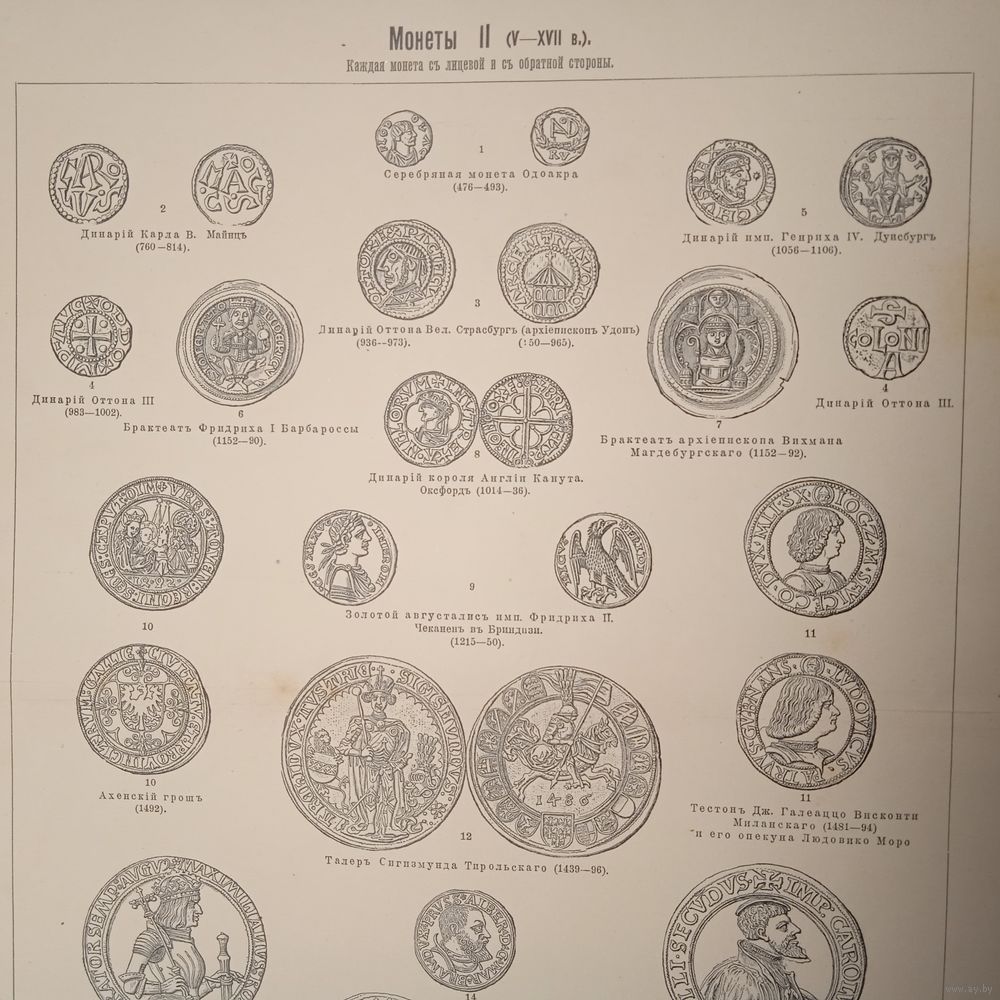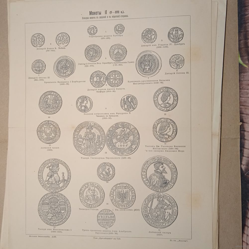 МОНЕТЫ 2 Энциклопедическая гравюра конец 19в. Спб. 32х24см.