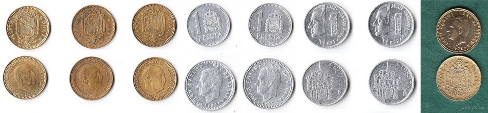 1 песета 1953, 1963, 1966(7), 1975(9), 1985, 1986, 1989, 1997;