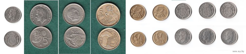5 песет 1957(8), 1975(7), 1980(3), 1983, 1984, 1989, 1991, 1992(2), 1997;
