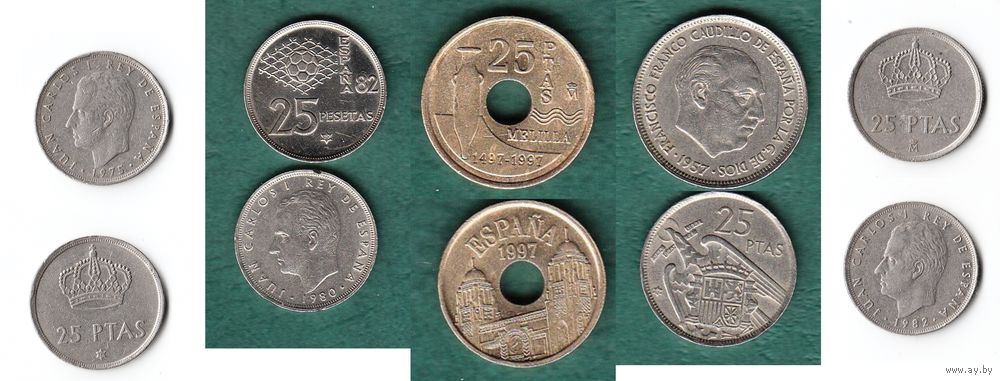 25 песет 1957, 1975, 1980(2), 1982, 1997;