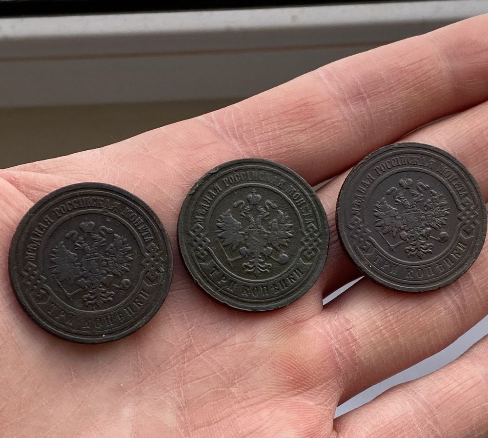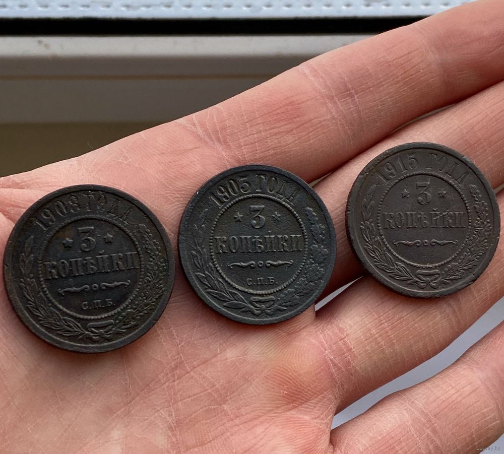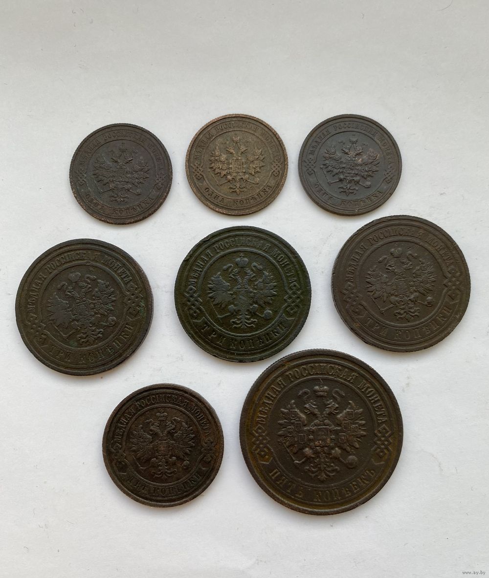 Монеты Николая 2, всего 8 штук. В продажу входят монеты: 1 копейка 1911, 1914, 1915 годов. 3 копейки 1903, 1908, 1915 годов. 2 копейки 1914 года. 5 копеек 1911 года.