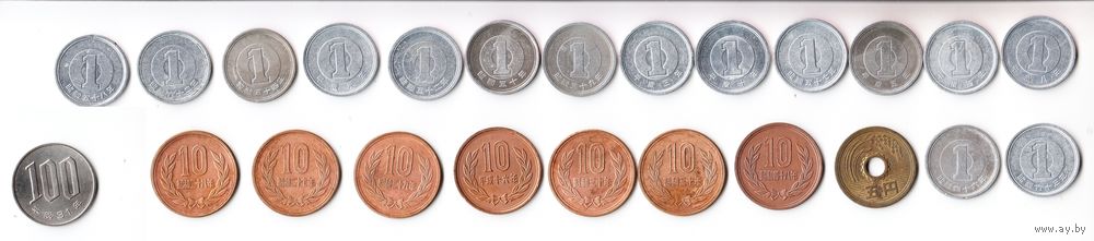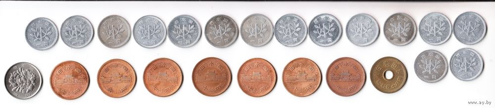 1 йена 1964, 1971(2шт.), 1975, 1977(2шт.), 1979, 1982(2шт.), 1983, 1987, 1988, 1989, 1991, 1992, 1993, 1996, 1998 годы;