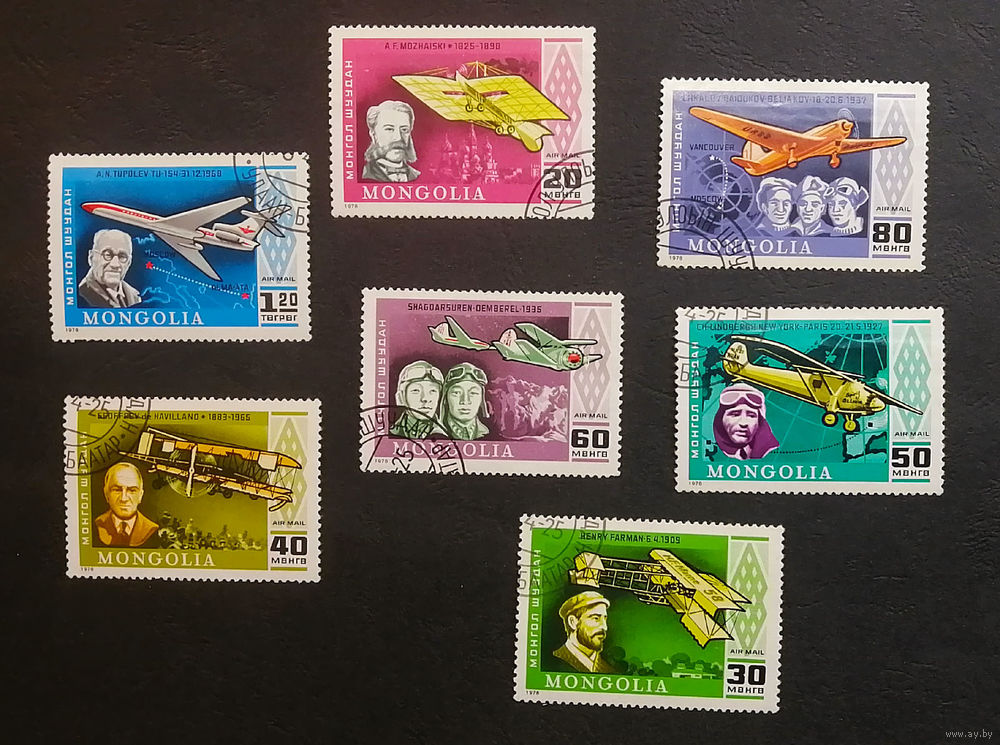 Монголия 1978 г. Авиация. 75-летие полета на самолете с двигателем, полная серия из 7 марок #0137-Т1P27
