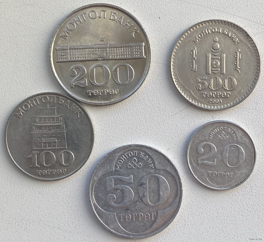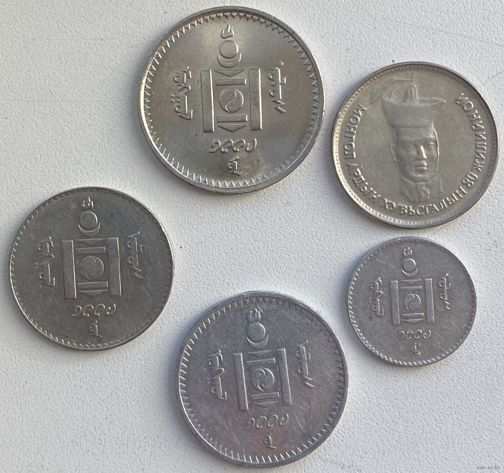 Монголия 20, 50, 100, 200 тугриков 1994 г., 500 тугриков 2001 г. 80 лет революции. Сухэ-Батор. Комплект 5 монет