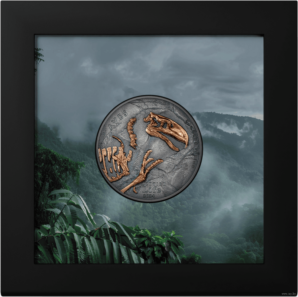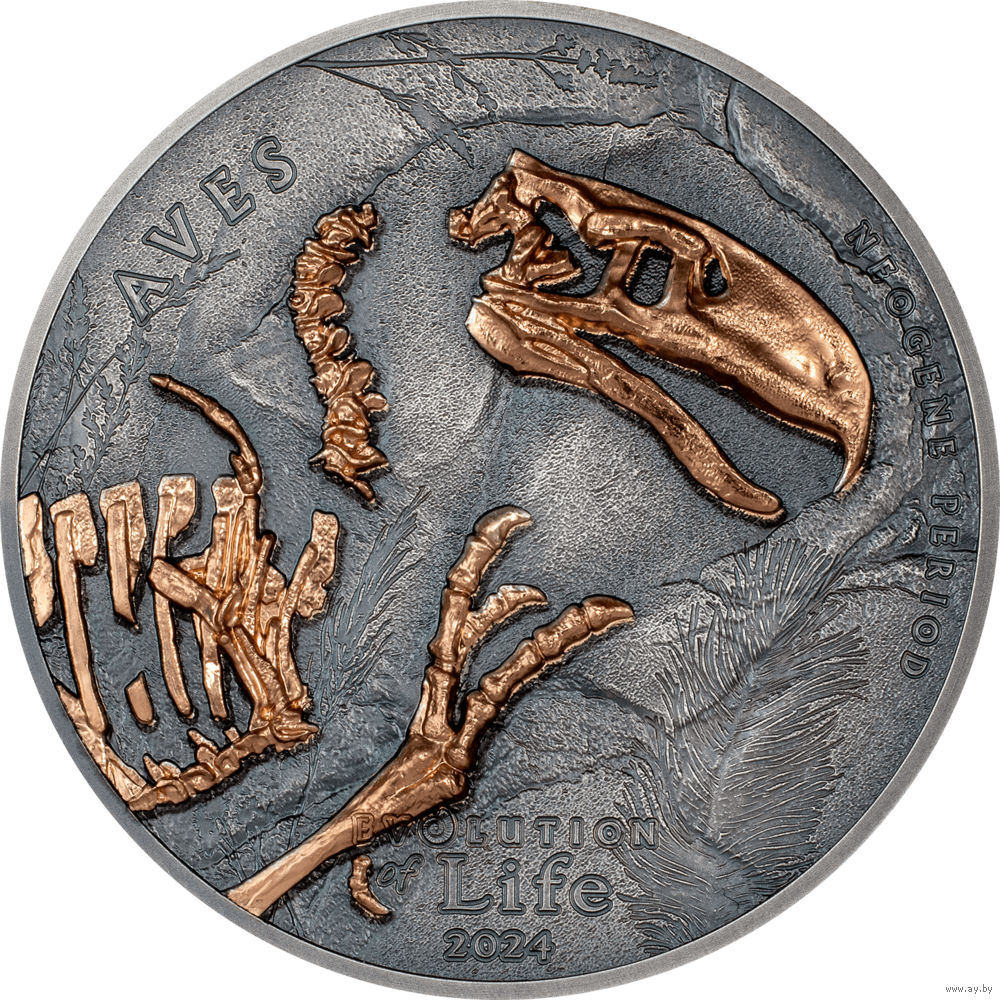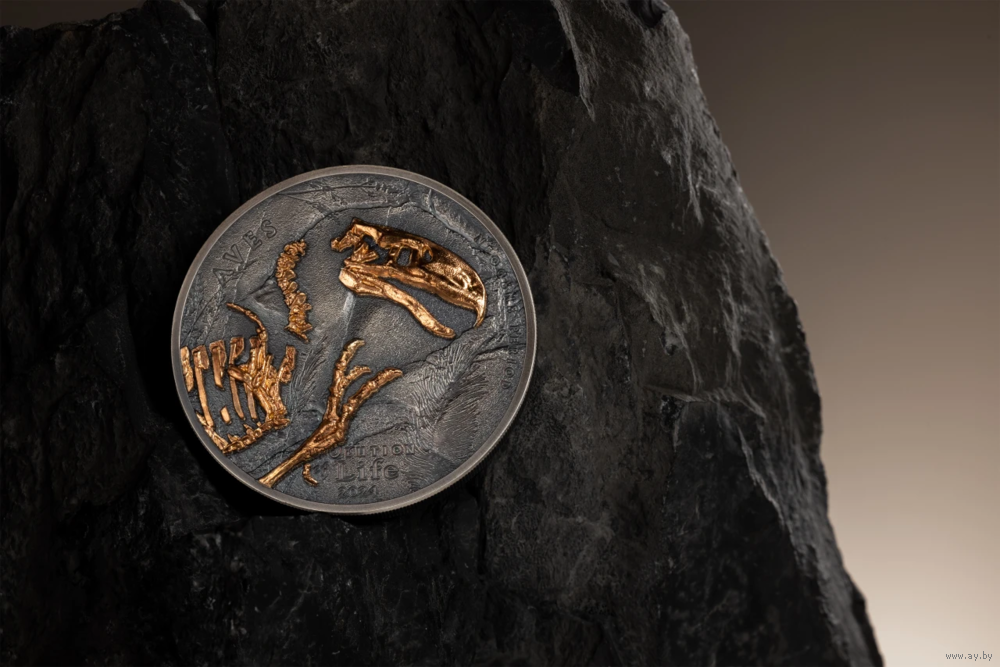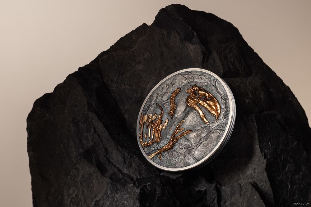 На монете представлены удивительные и детализированные окаменелости Форорацида покрытые розовым золотом с высоким рельефом (Smartminting).